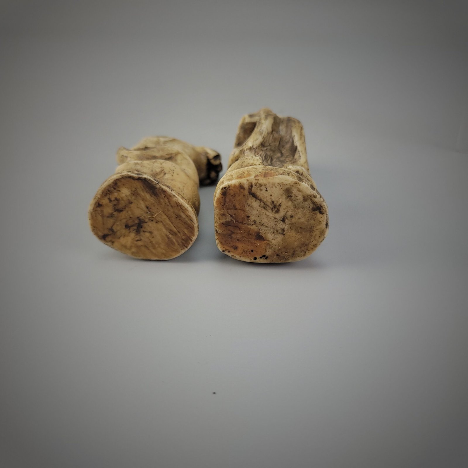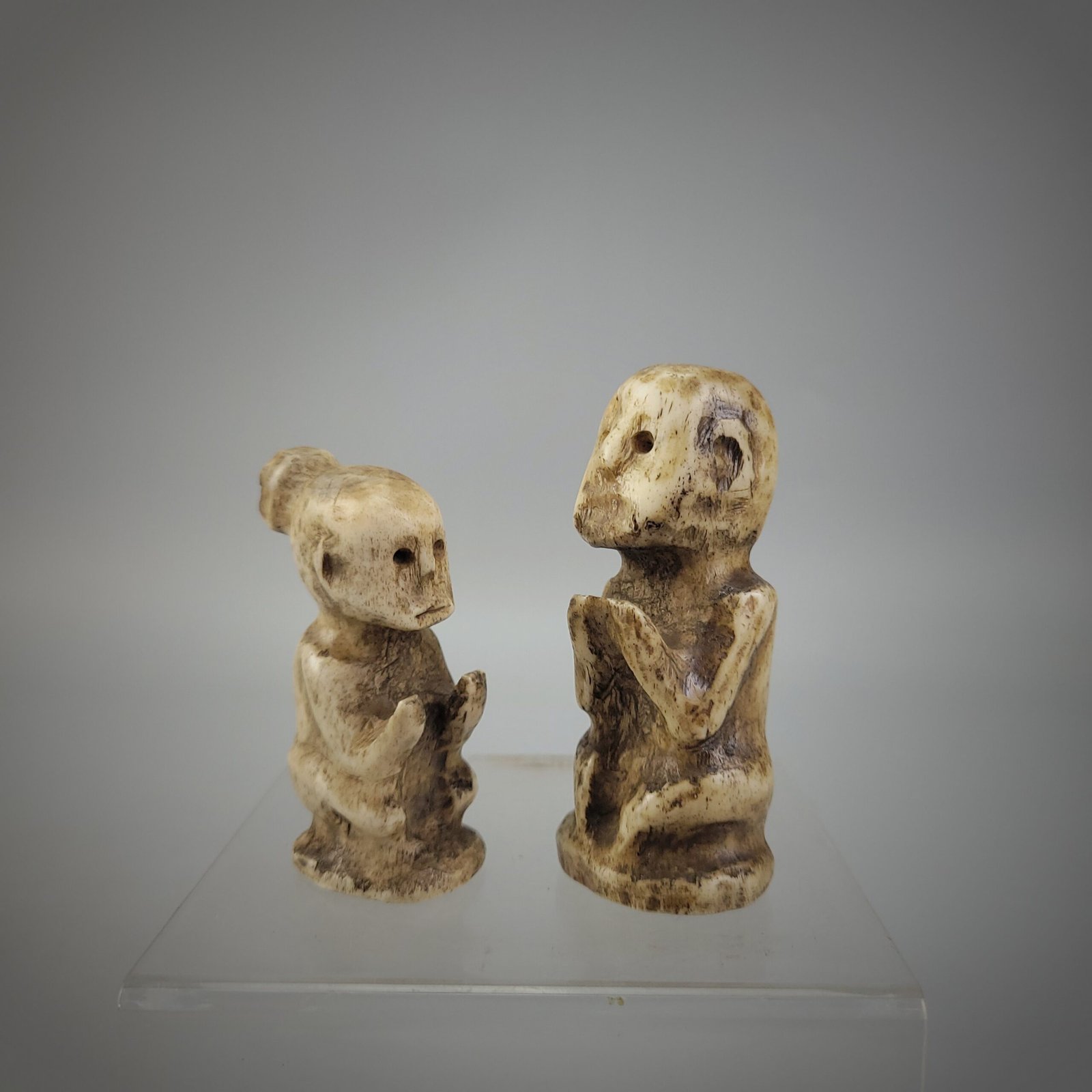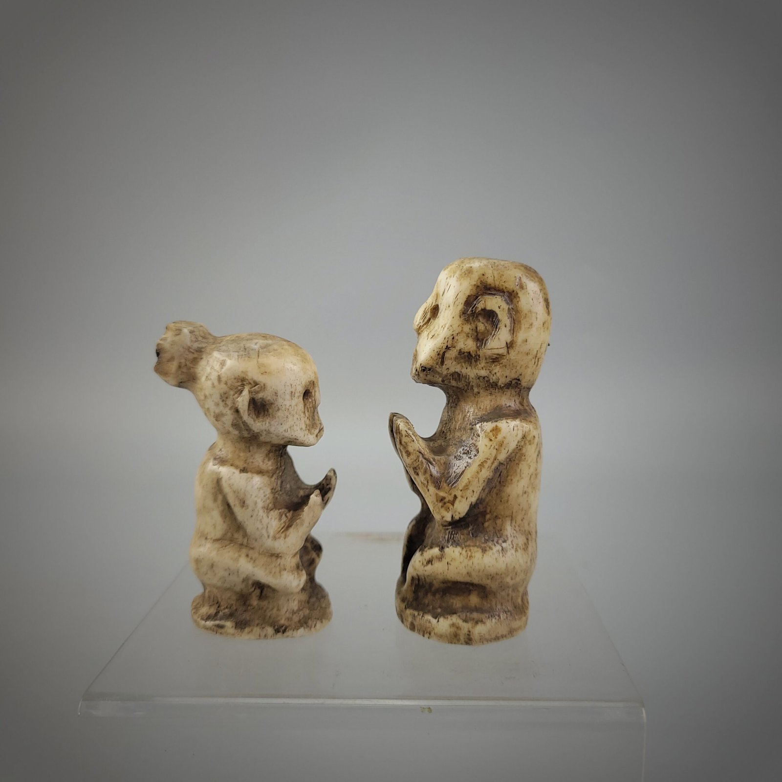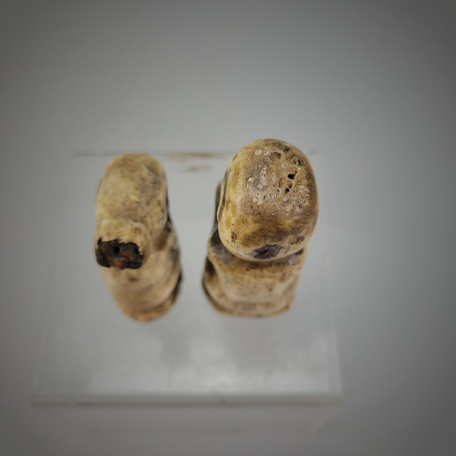 A pair of Dayak Iban fertility charms carved from antler, representing male and female figures in a stylized, human like form. Each figure is compact and hand carved, with softly rounded heads, minimal facial features, and arms bent inward toward the chest. The surfaces show a warm, aged patina with darker areas from handling and time, emphasizing their authenticity and use.