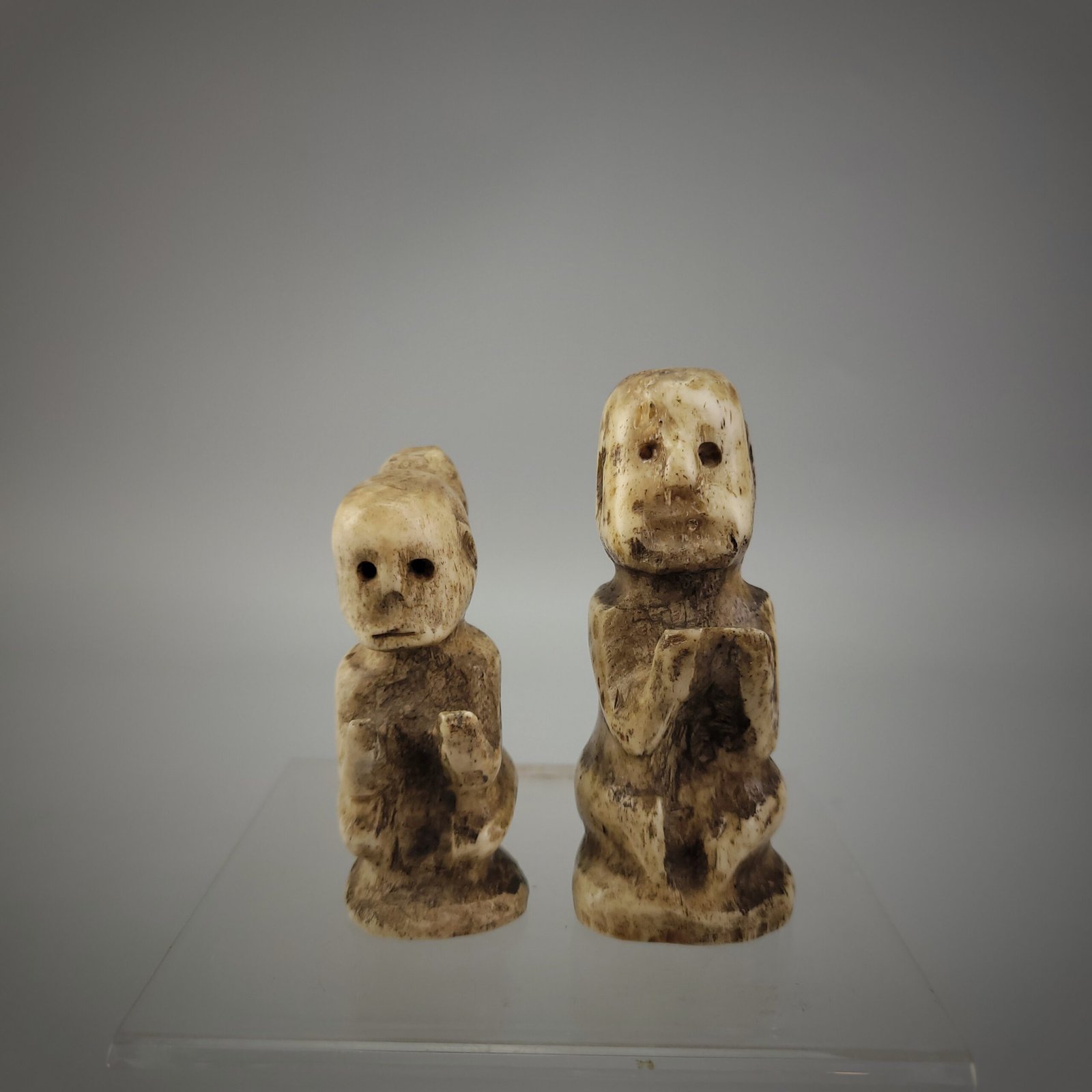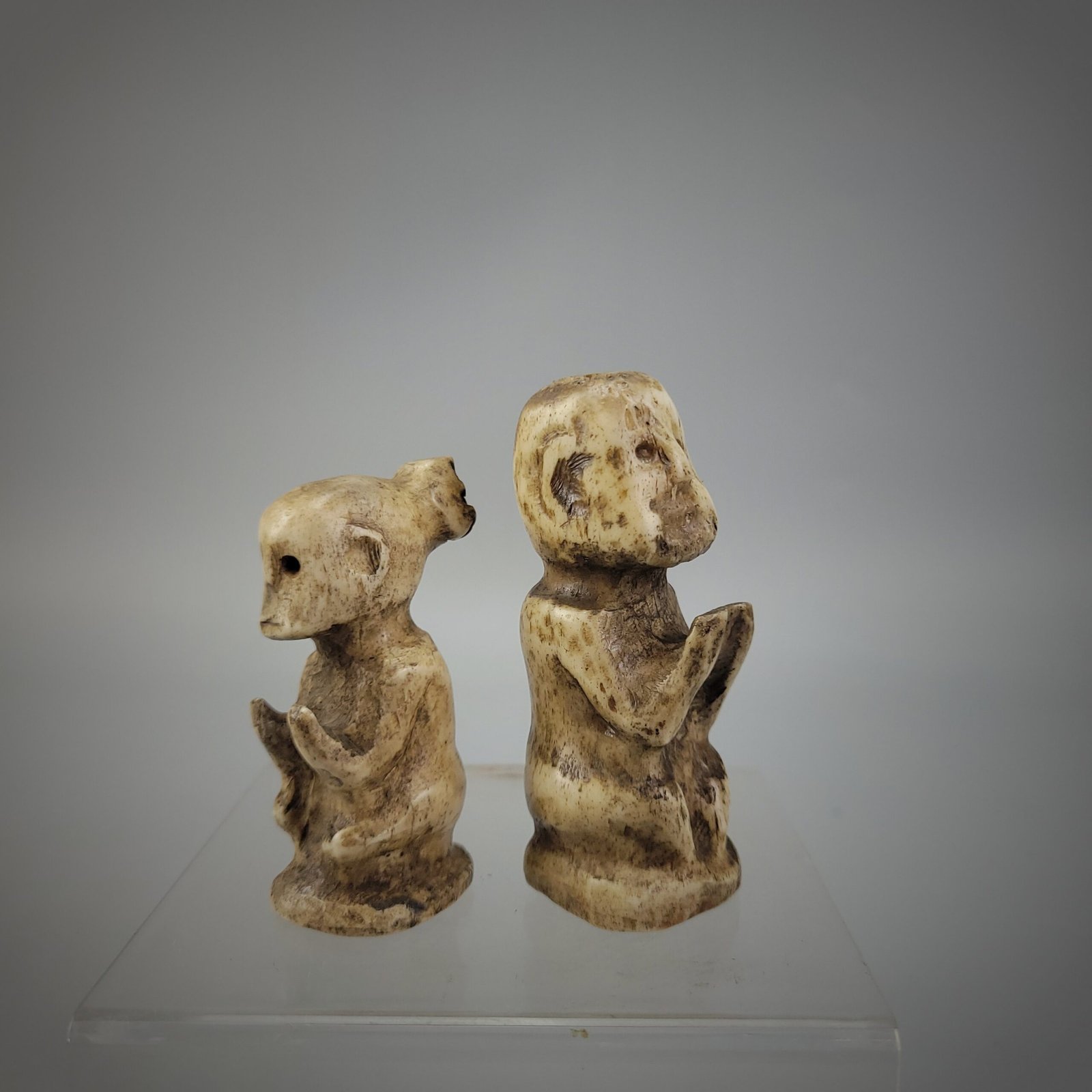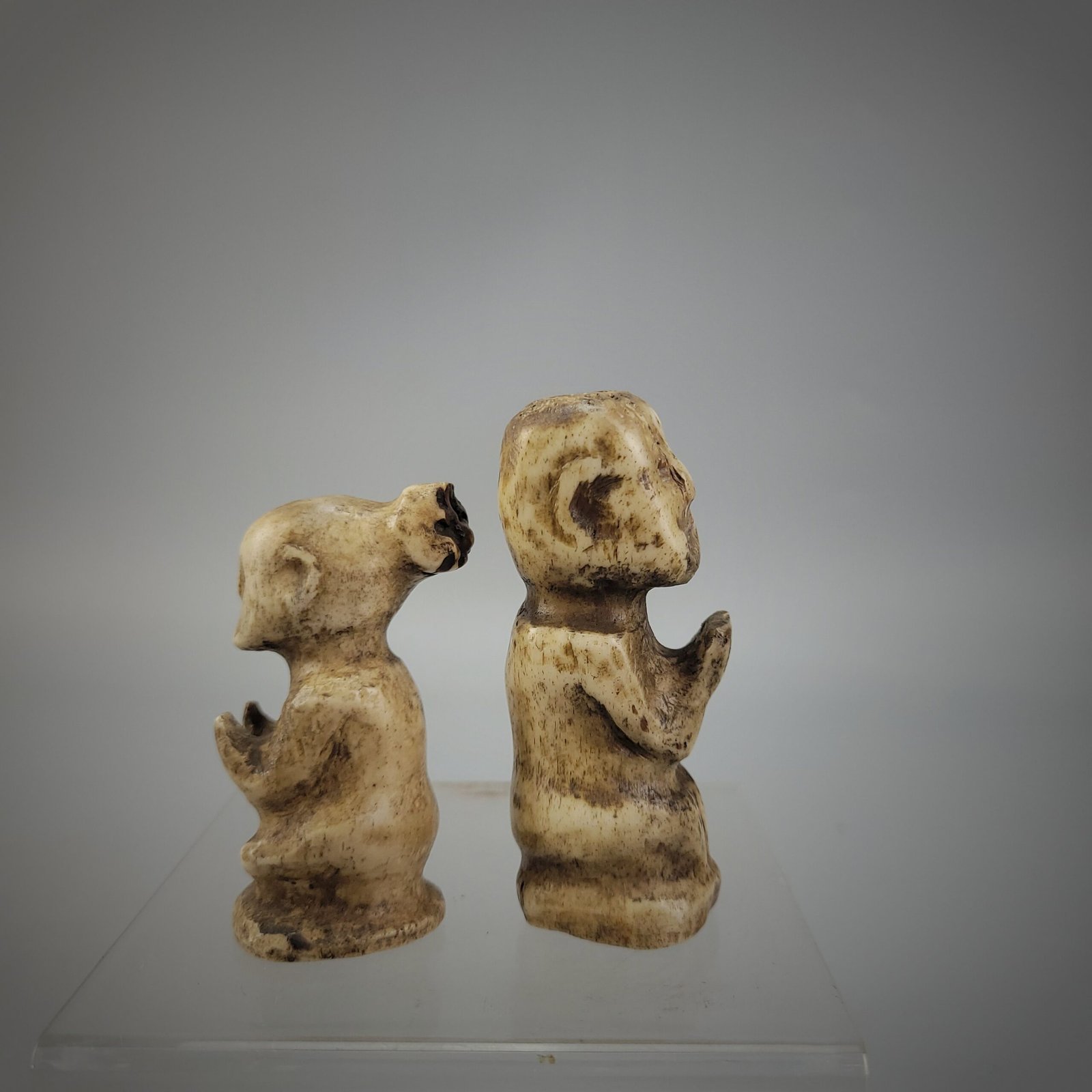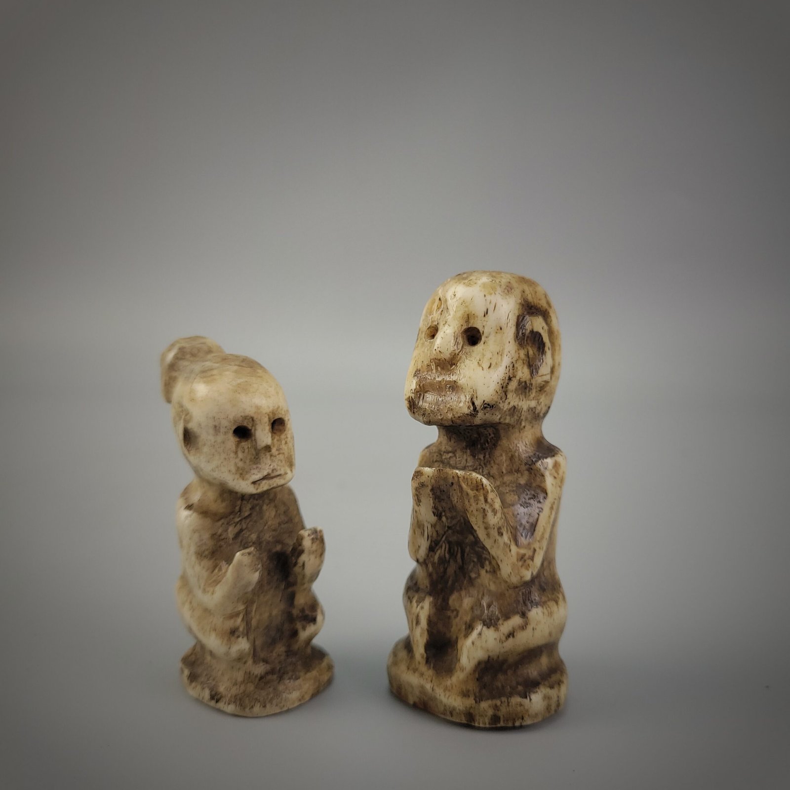 A pair of Dayak Iban fertility charms carved from antler, representing male and female figures in a stylized, human like form. Each figure is compact and hand carved, with softly rounded heads, minimal facial features, and arms bent inward toward the chest. The surfaces show a warm, aged patina with darker areas from handling and time, emphasizing their authenticity and use.