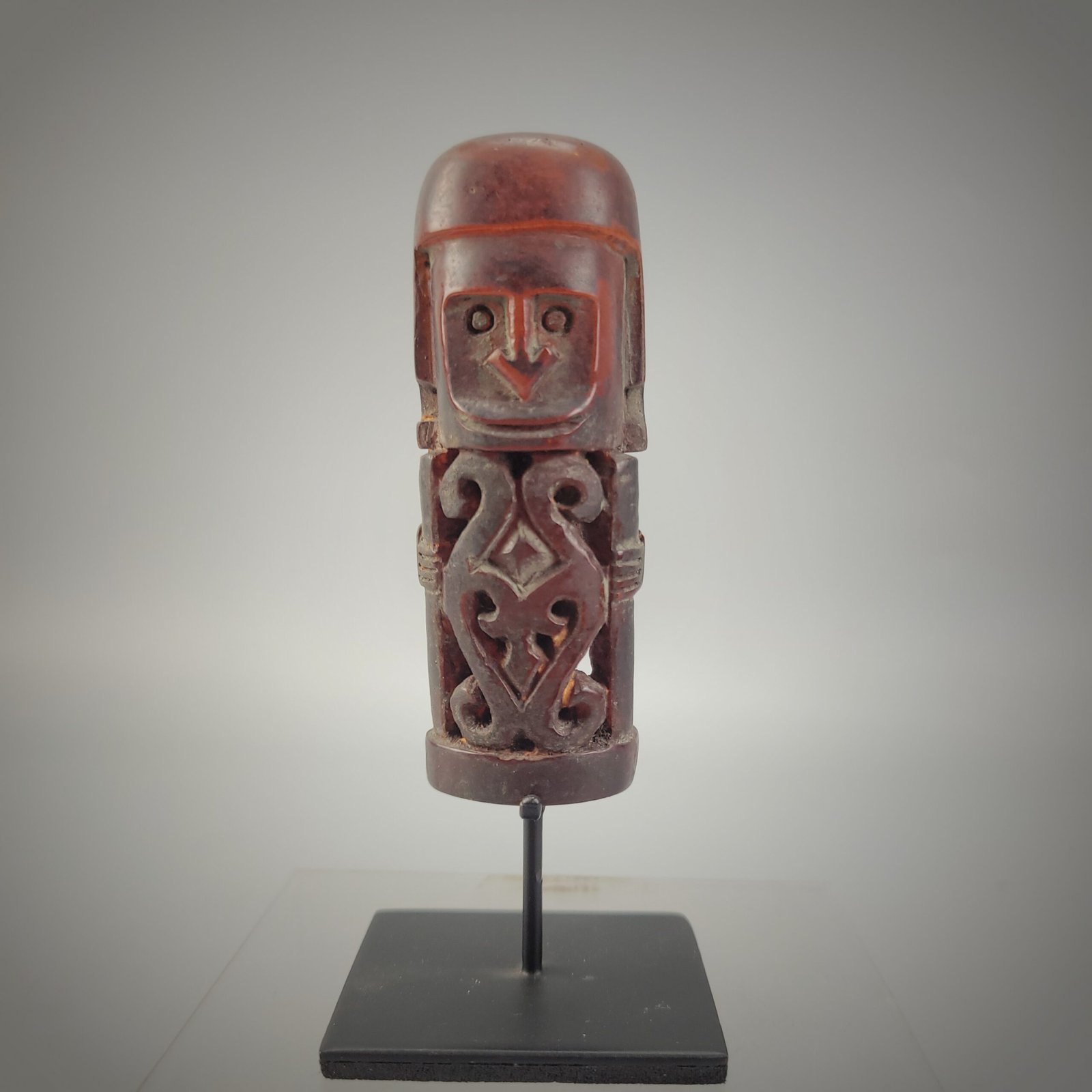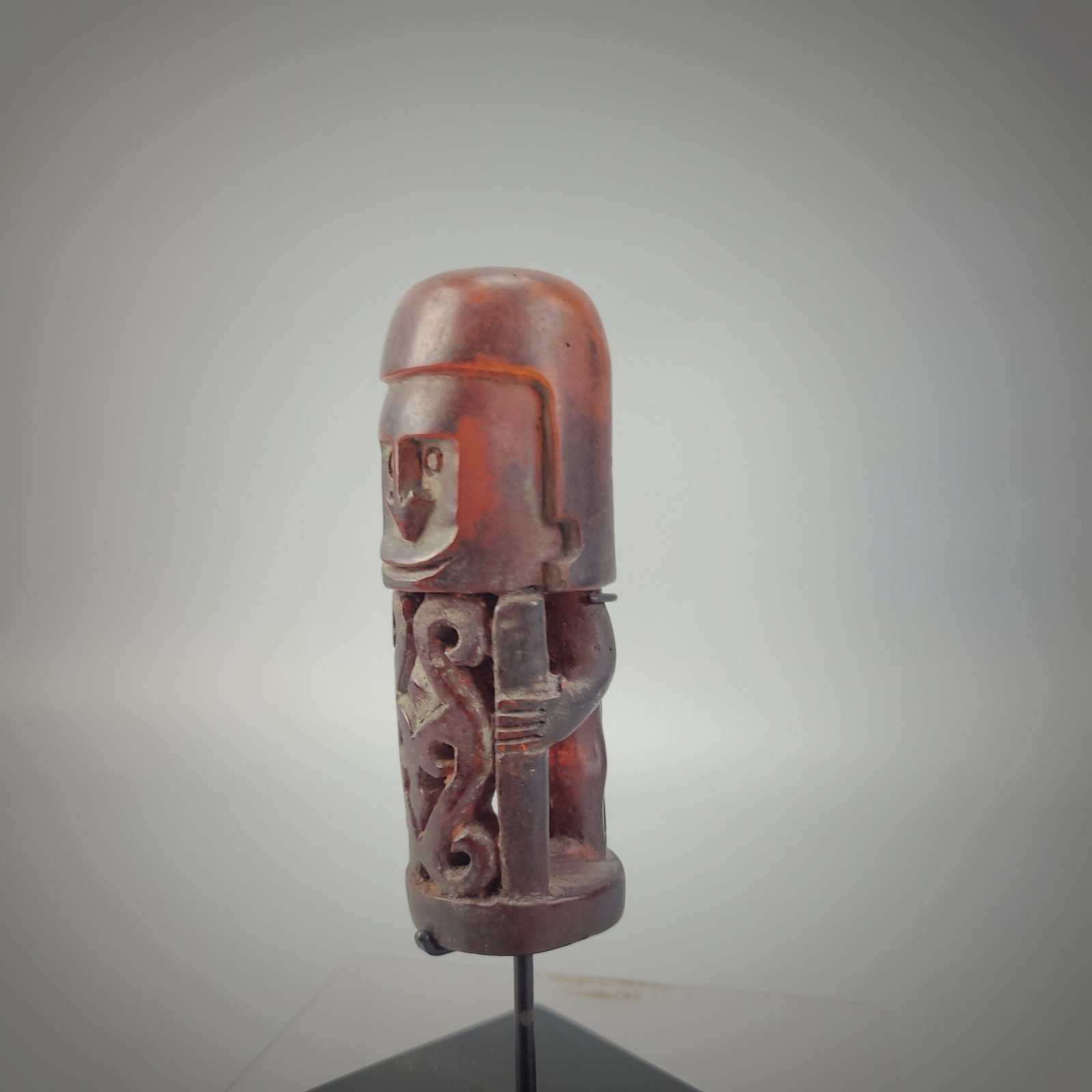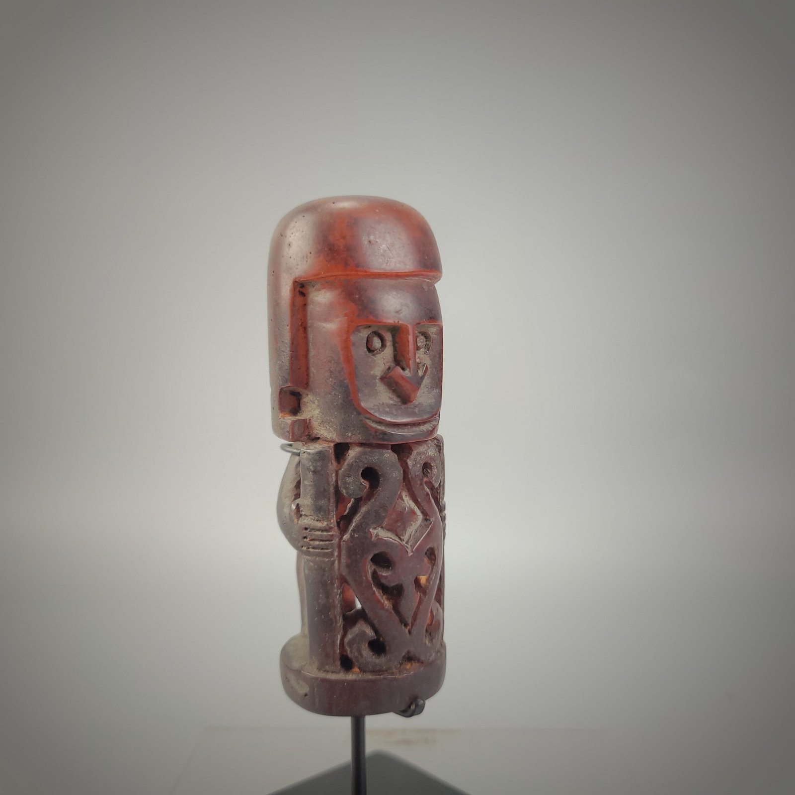 The torso is intricately openworked, revealing symmetrical scroll motifs and a central diamond-shaped element, suggestive of symbolic or protective iconography. The sides show simplified arms bent inward, grasping a vertical element that may represent a staff, tool, or ritual object—potentially reinforcing its interpretation as a guardian or intermediary figure.