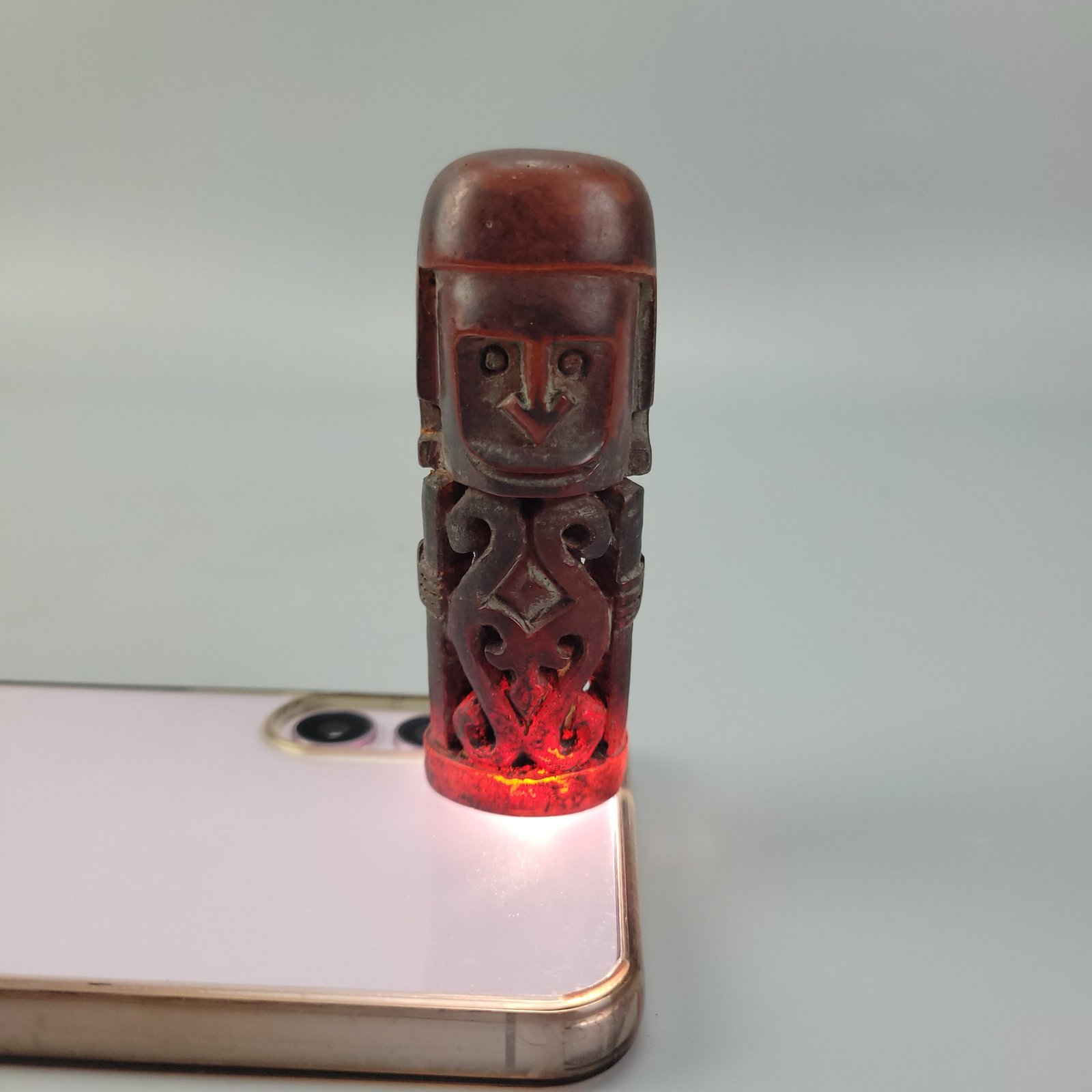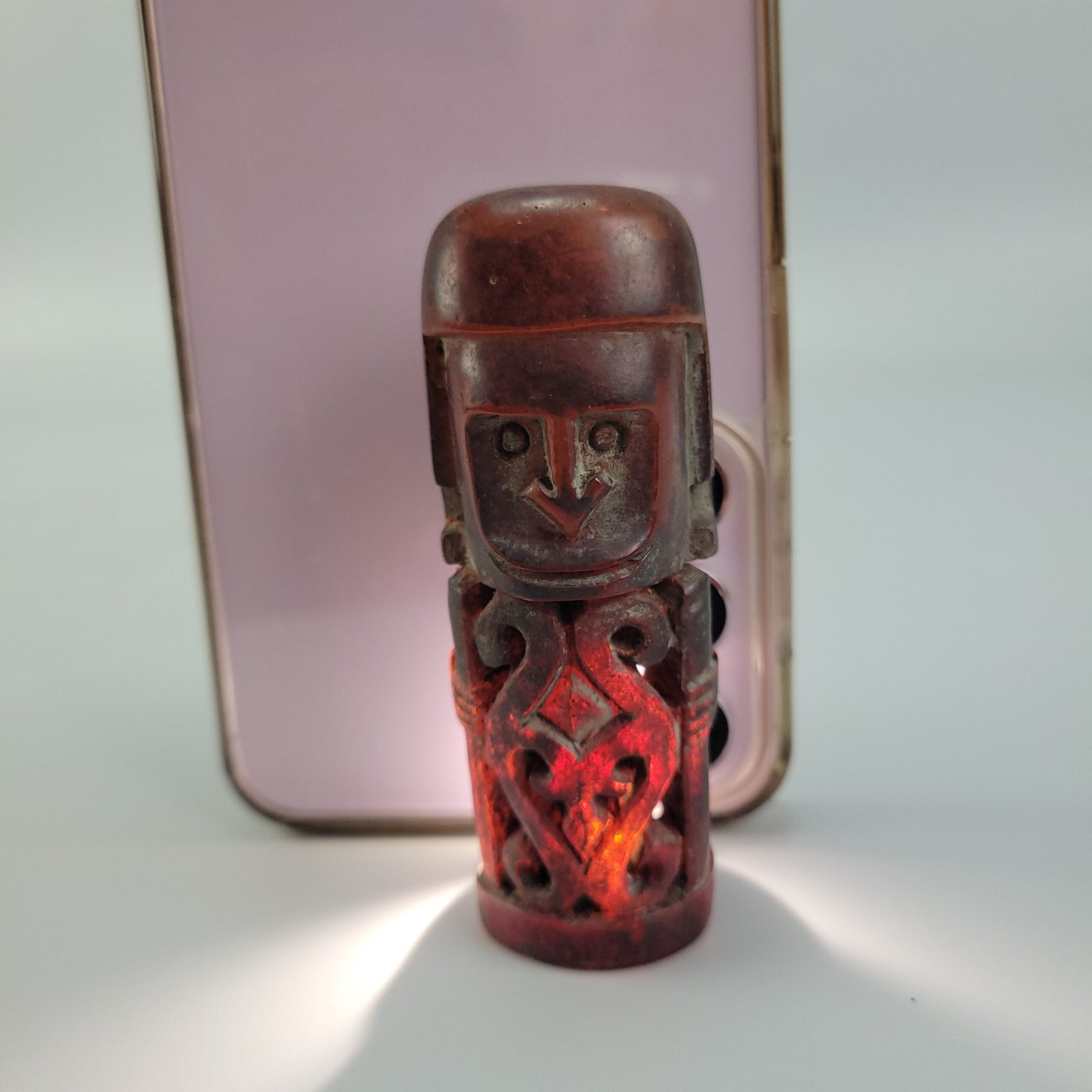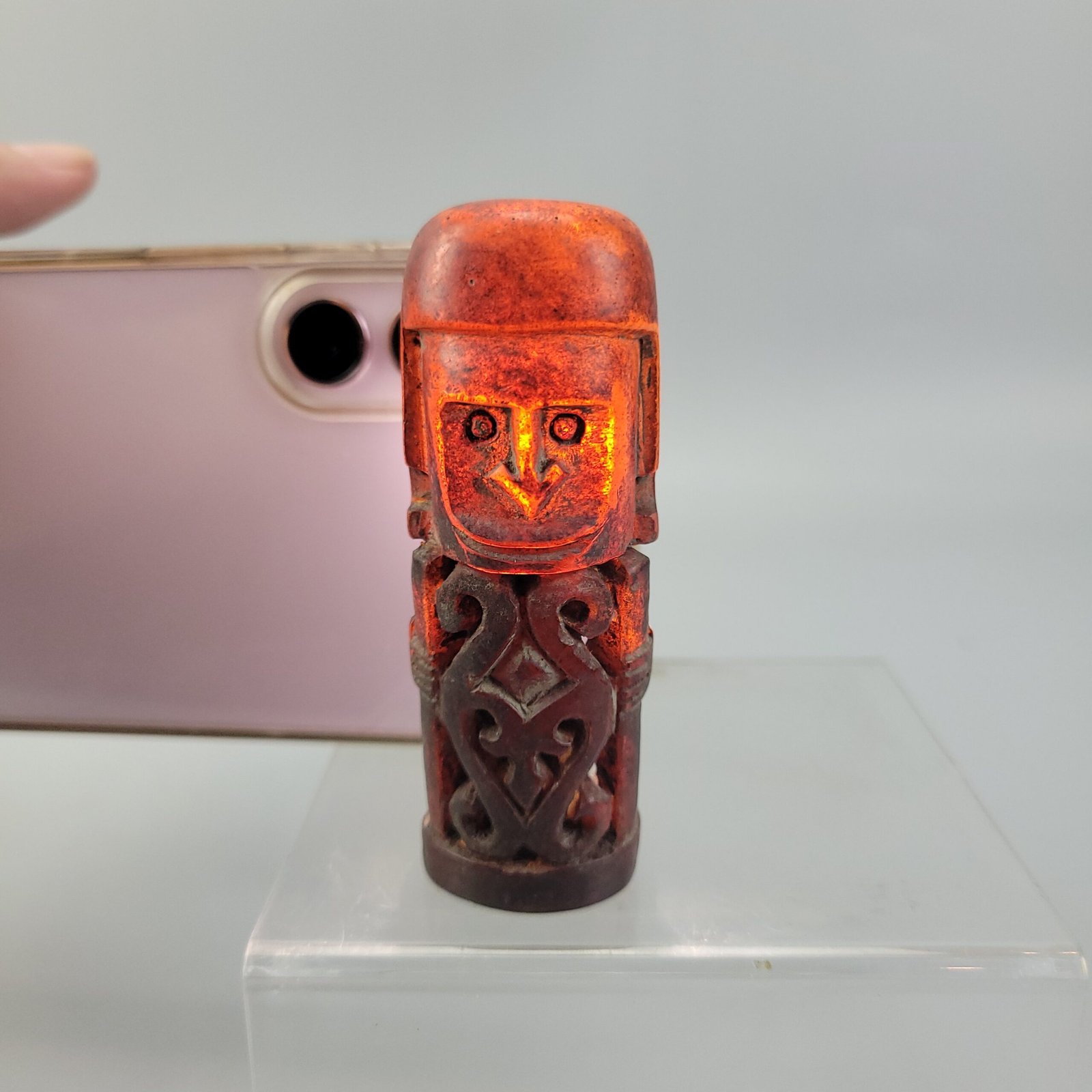 The amber’s natural inclusions and slight surface pitting contribute to its organic texture, while the polished exterior enhances its luminous quality. When backlit, the figure glows vividly, emphasizing both the material’s depth and the carved details.