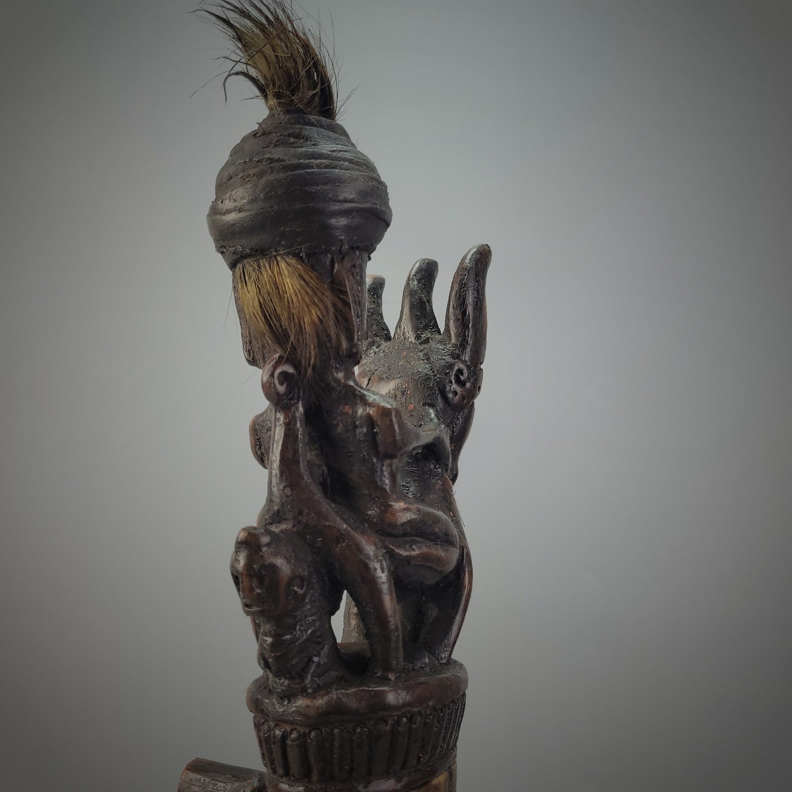 A small tuft of animal hair inserted into the headdress adds ritual authenticity.