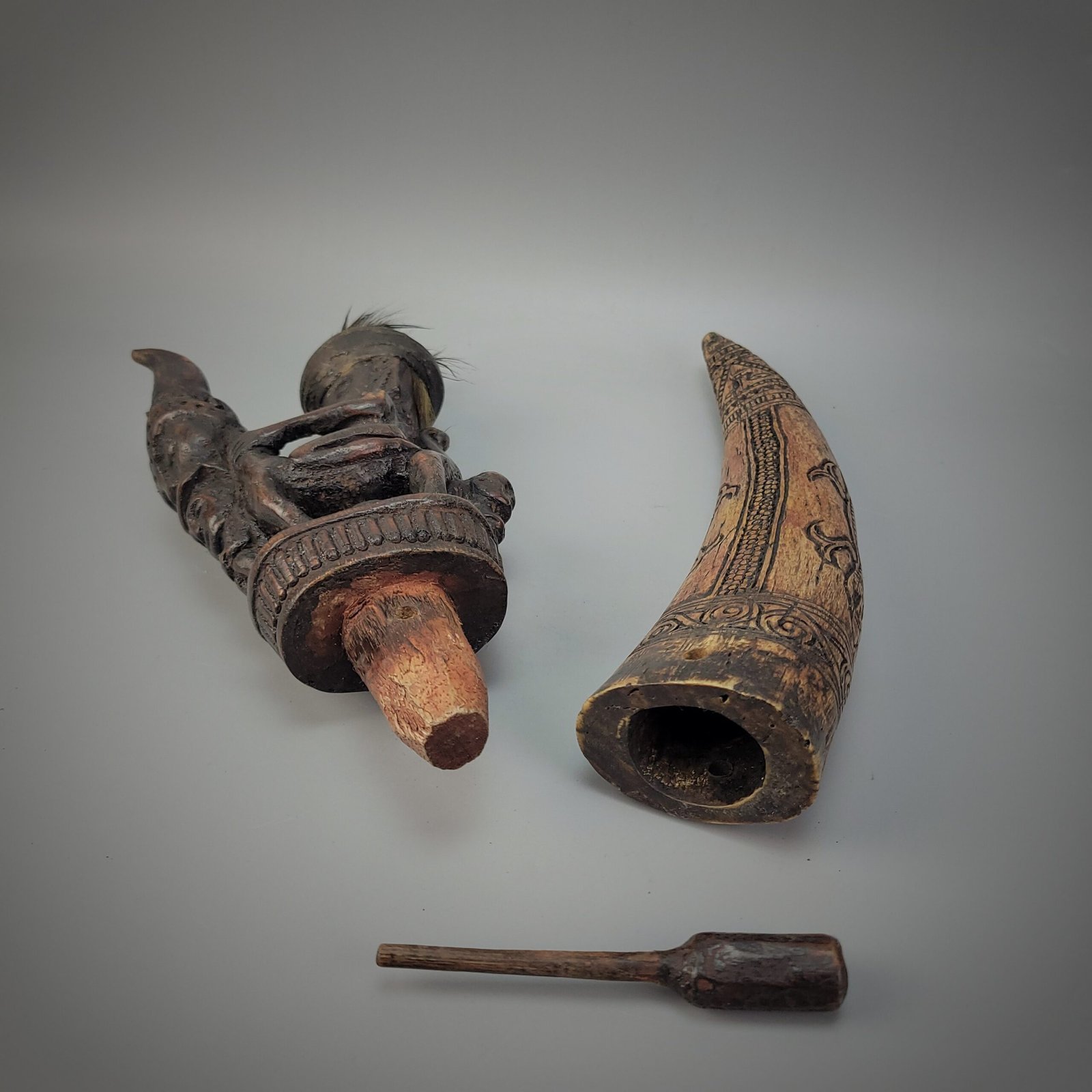 This is an exceptional Batak ritual container, traditionally used to hold pagar, magical materials, or medicinal mixtures prepared by a datu (shaman). The piece consists of a carved buffalo horn vessel and a wooden stopper with a highly detailed sculptural finial, complete with its original internal mixing stick.