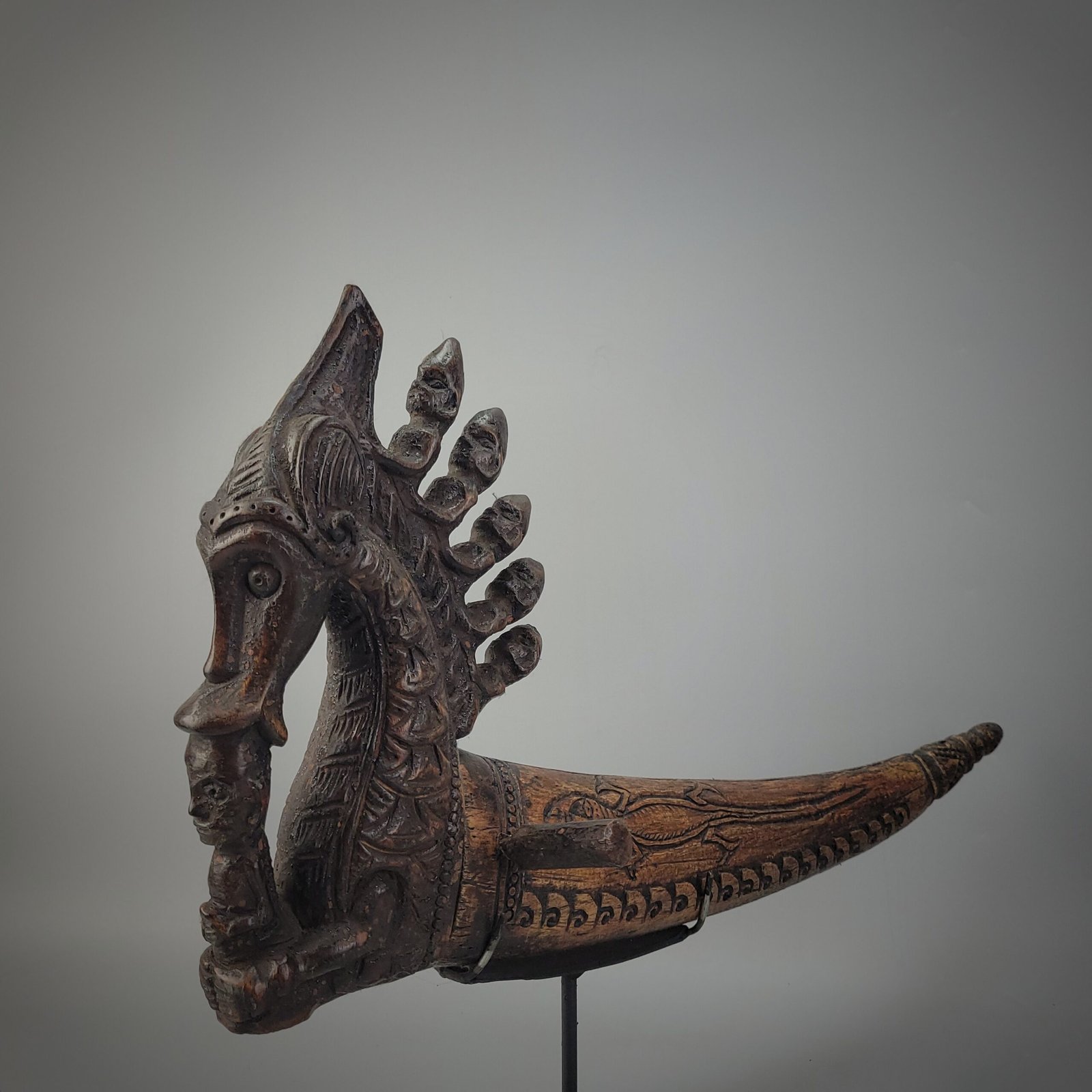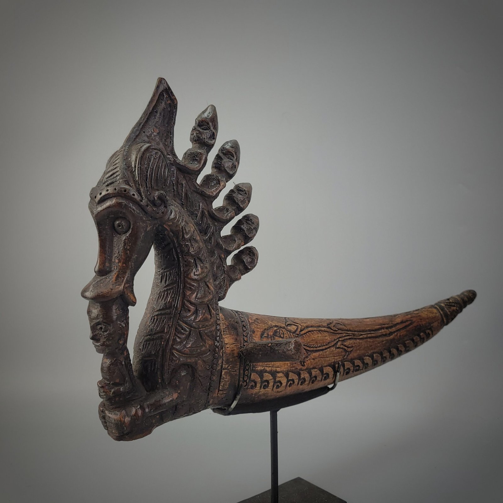 This exceptional Batak ritual horn presents a powerful blend of mythic symbolism and ceremonial craftsmanship from the Toba Batak people of North Sumatra. The stopper is carved in an elaborate arched form, featuring a central anthropomorphic–zoomorphic figure crowned with six radiating human heads, an iconic Batak motif representing ancestral spirits, protective forces, and the layered spiritual realms within Batak cosmology.