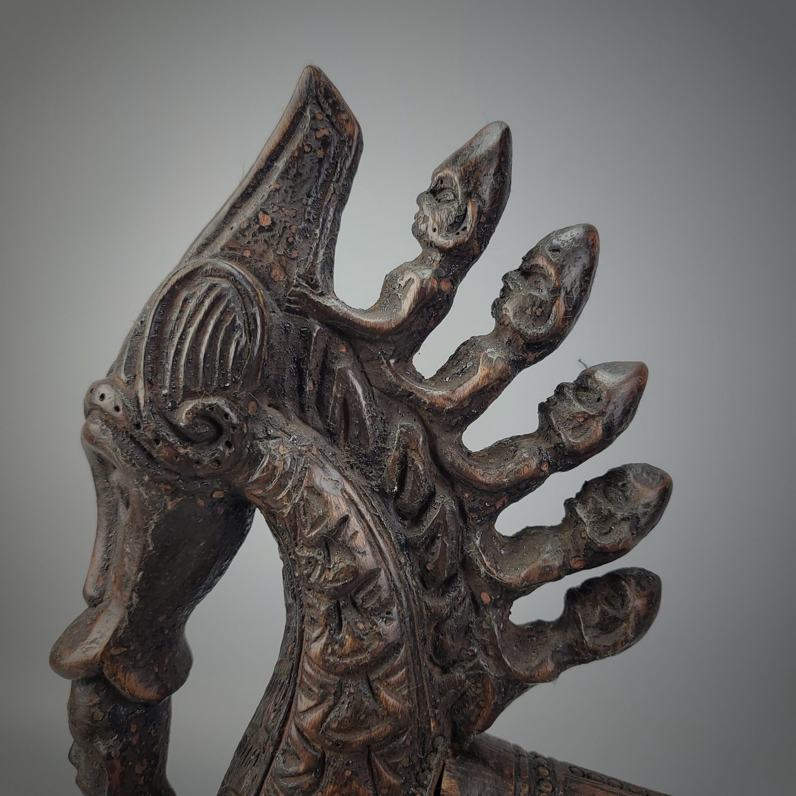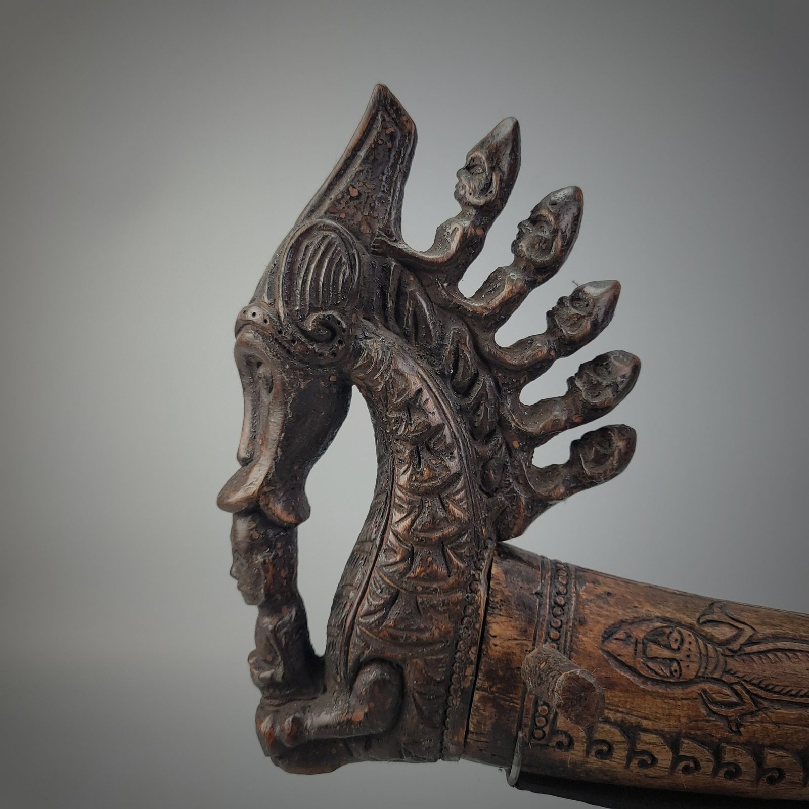 The primary figure displays stylized facial contours, a pronounced nose, and textured surface detailing that echoes serpent-like or dragon-like forms—beings often associated with protection and ritual potency. The radiating heads suggest the presence of multiple guardian entities, reinforcing the horn’s role as an object used by a datu (ritual specialist) in healing, divination, or ceremonial rites.