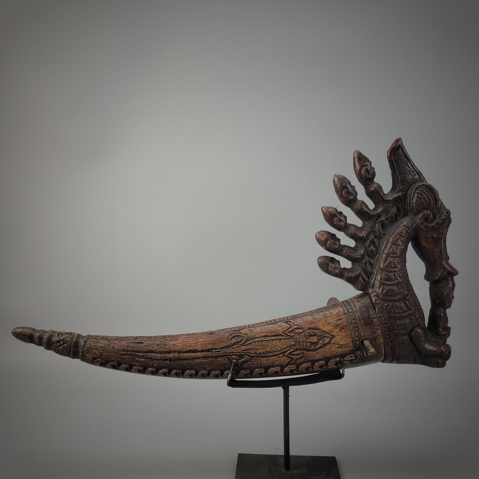 The elongated horn body is decorated with incised human figures and geometric motifs, emphasizing ancestral reverence and spiritual continuity. These carvings reflect the Batak belief in the active presence of ancestors, invoked for guidance, protection, and ritual empowerment.
