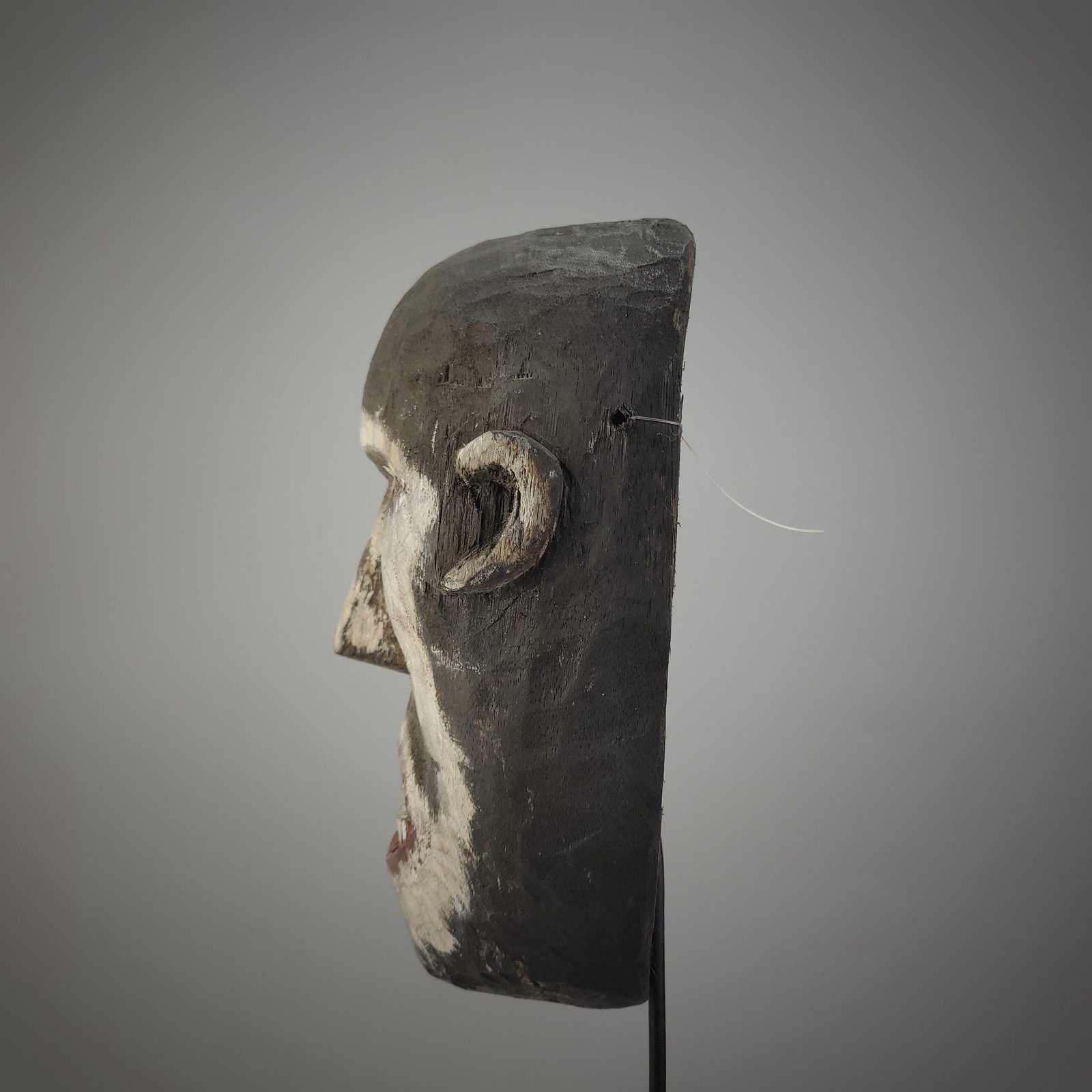 This Dayak Bidayuh ceremonial dance mask presents a powerful and expressive human visage, carved in a bold, sculptural style that emphasizes spiritual presence over naturalism. The face is broad and slightly flattened, with strong geometric planes that give it a commanding, almost ancestral authority.