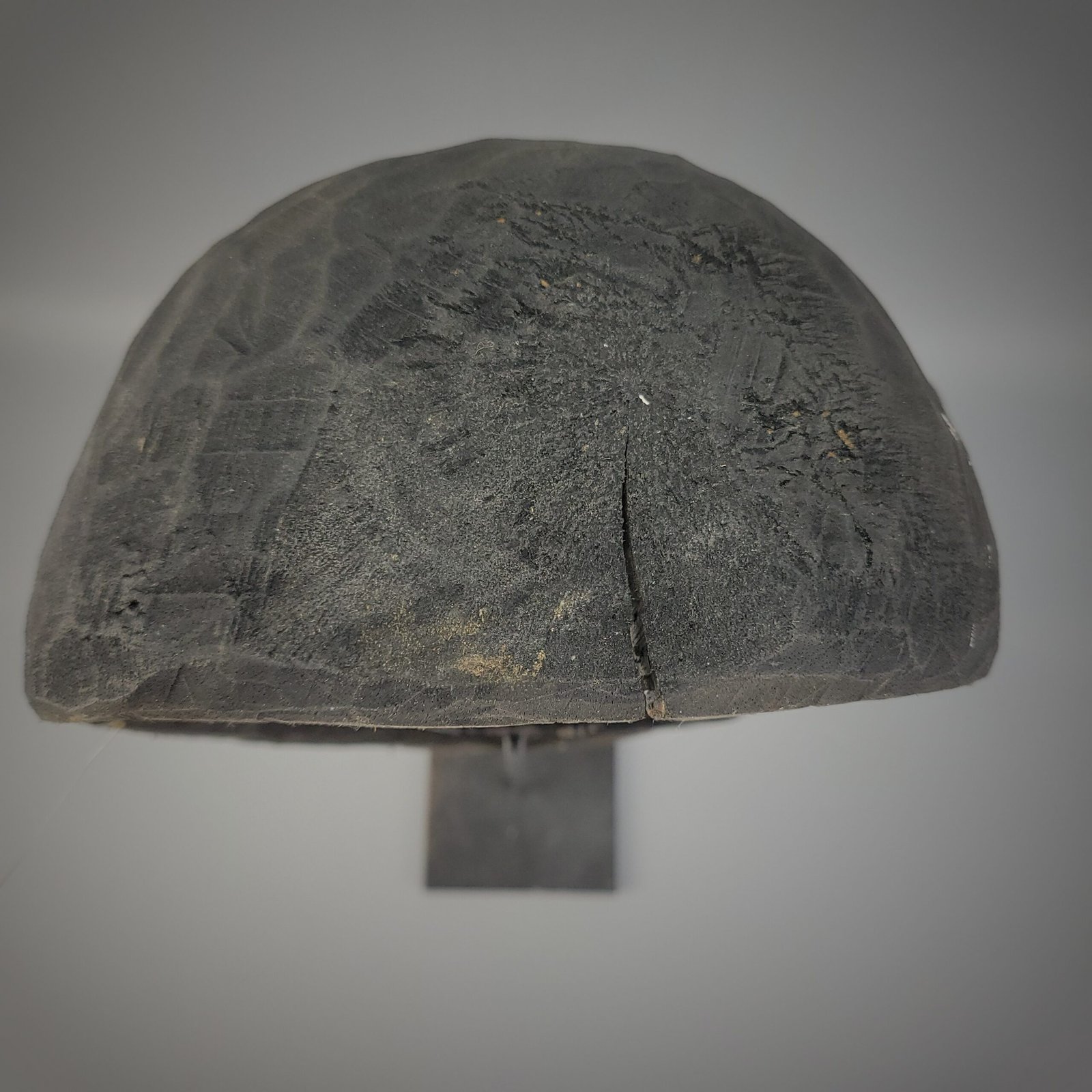 The forehead and crown are painted in deep matte black, forming a cap-like field that contrasts sharply with the lighter face below. A pale horizontal band across the brow frames the hollowed eye openings, heightening the mask’s intense, inward gaze. The eyes are narrow and elongated, cut cleanly through the wood, allowing the wearer to see while maintaining the mask’s austere, otherworldly expression.