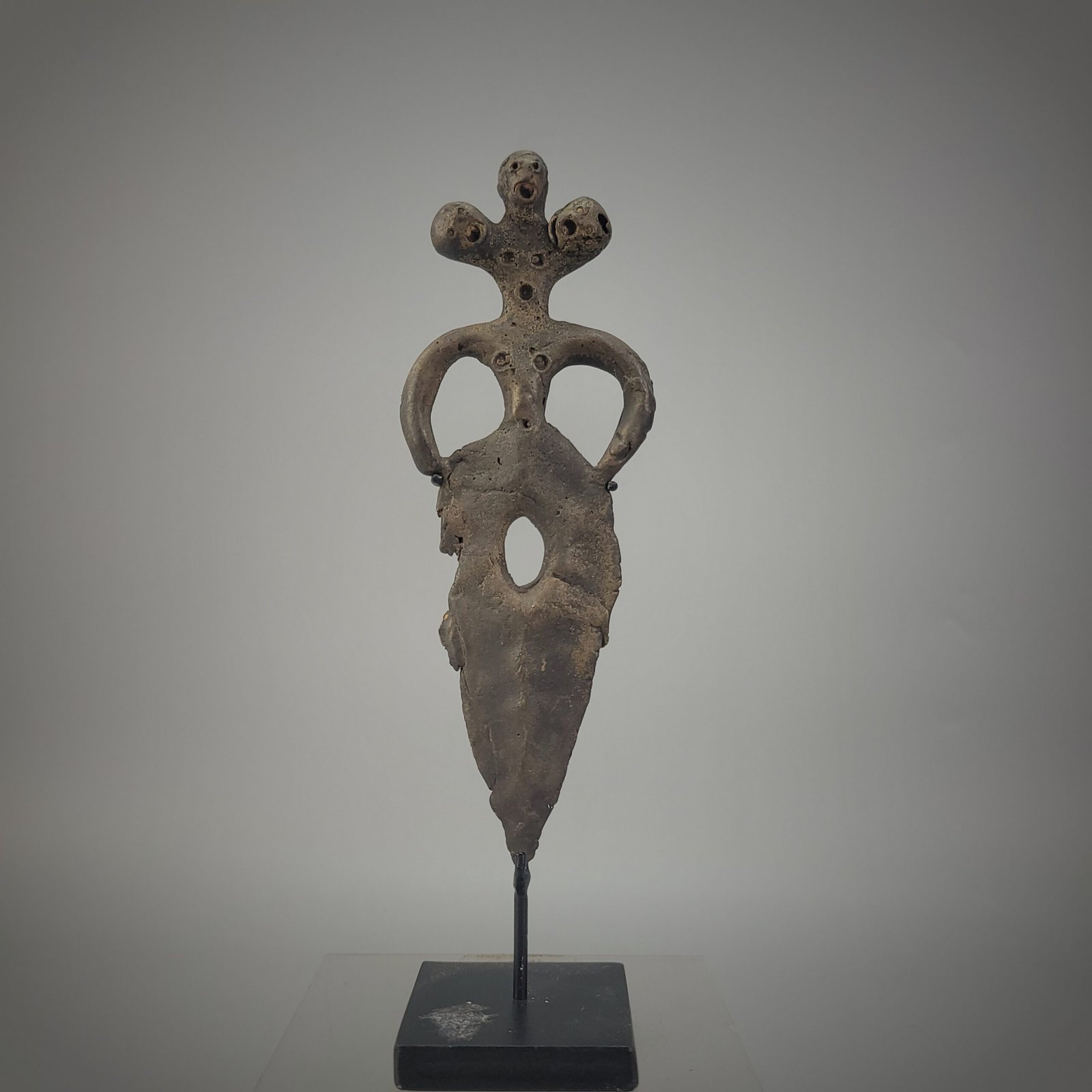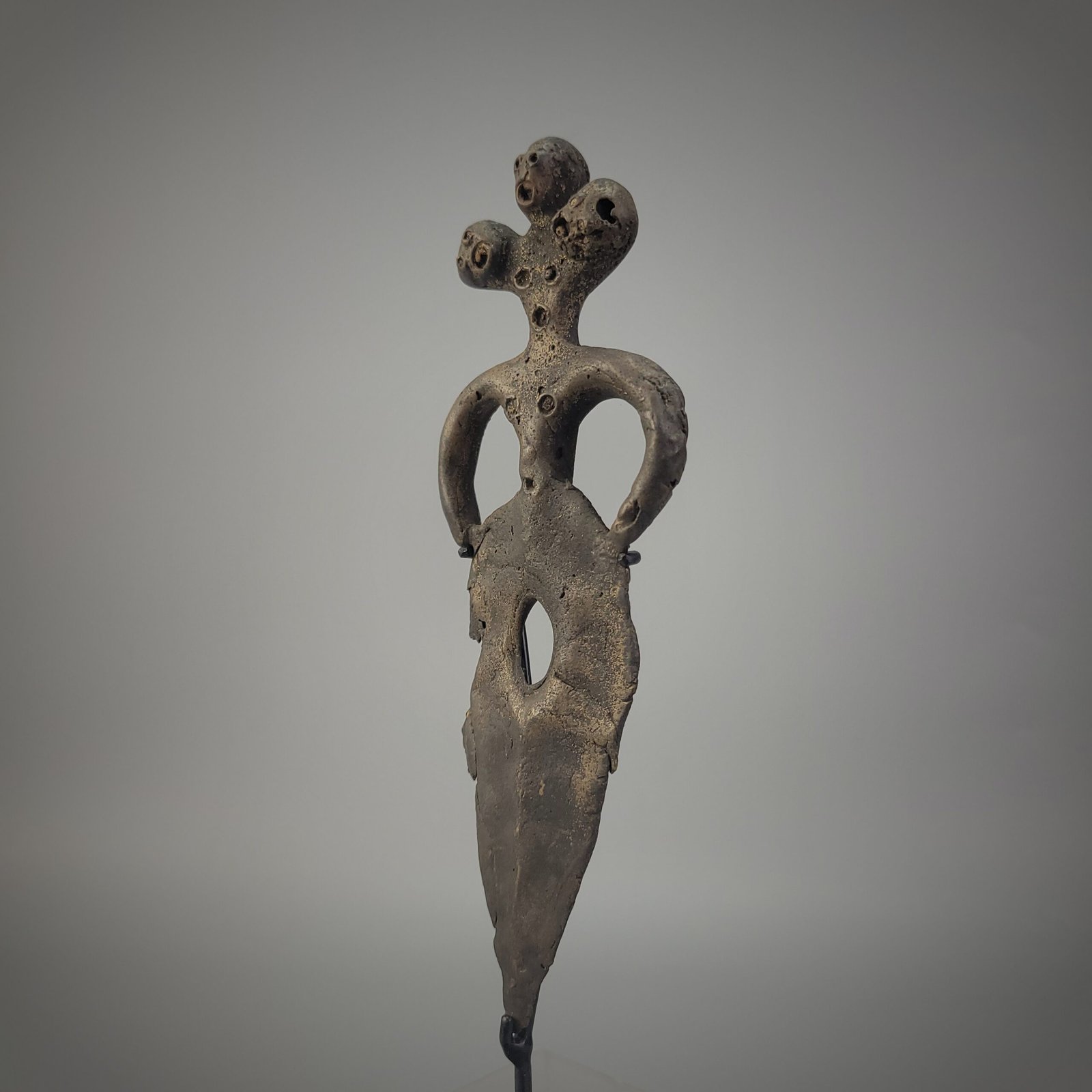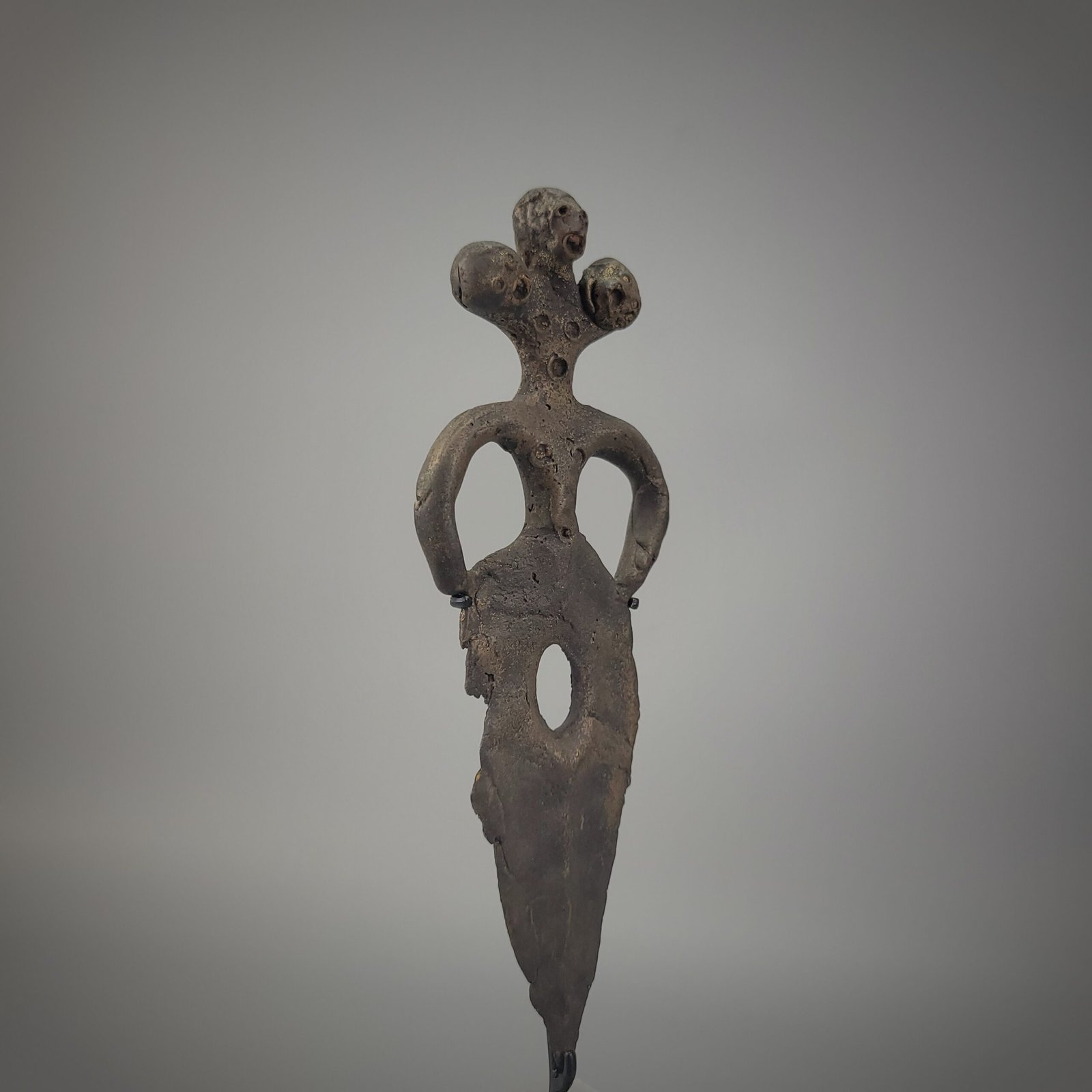 The torso is elongated and perforated with a series of small circular openings, a feature commonly associated with symbolic or ritual intent rather than utilitarian function. The blade descends seamlessly from the figure into a narrow, tapering form, pierced by an oval aperture near its center. This interruption of the blade’s surface further supports the interpretation of the object as ceremonial rather than martial.