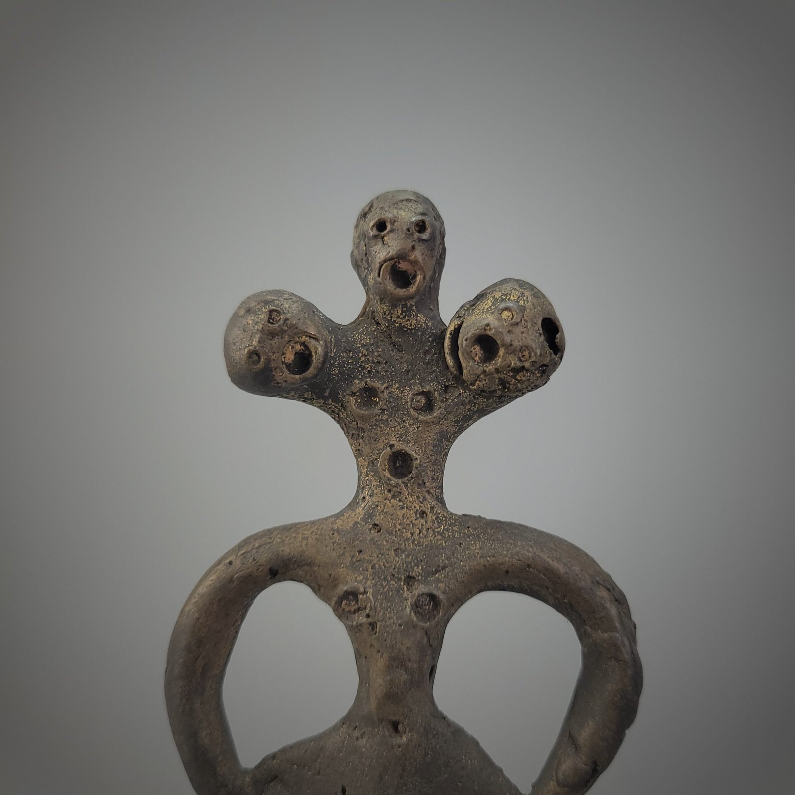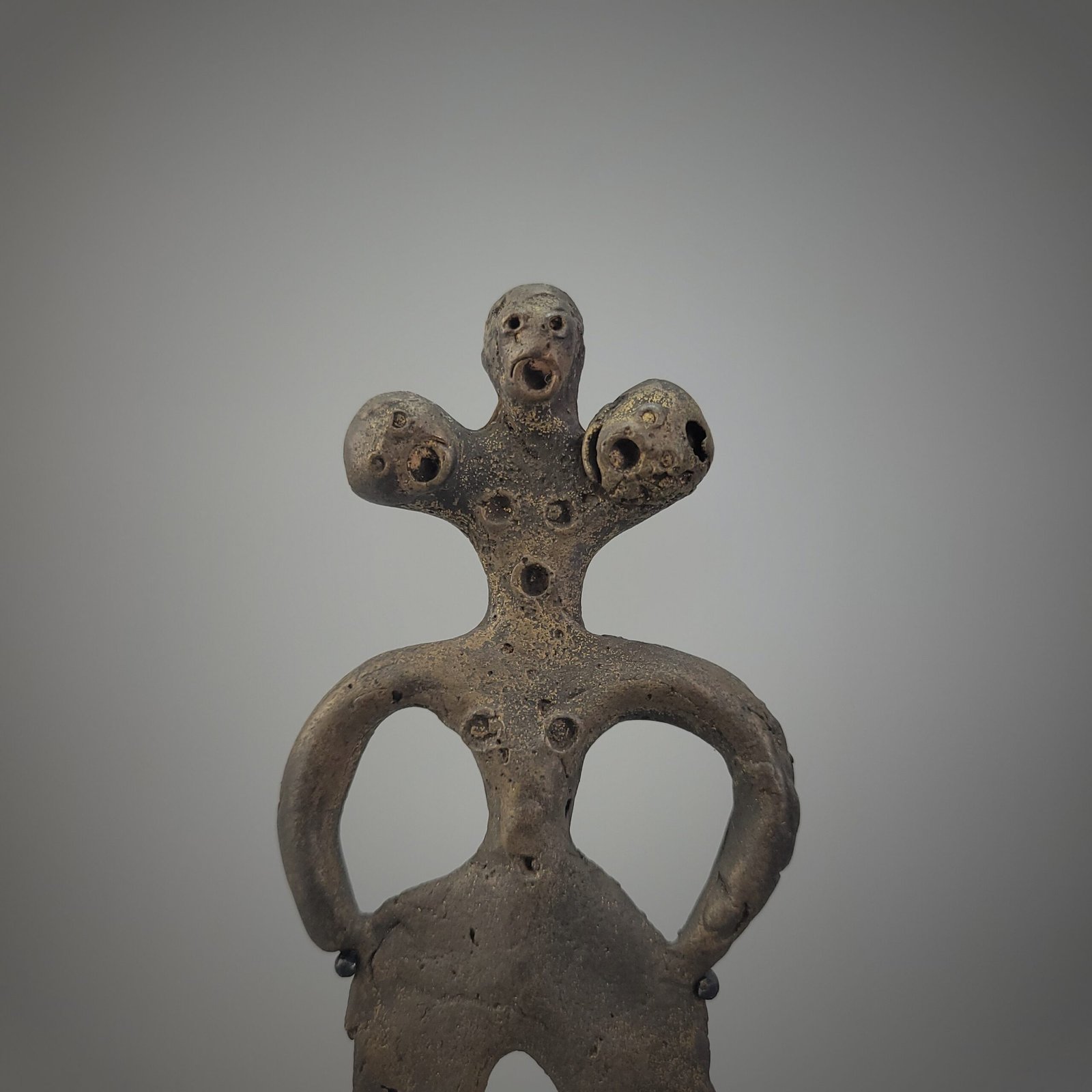 This ceremonial bronze dagger from Java is distinguished by its fully integrated anthropomorphic form, in which hilt and blade are conceived as a single sculptural composition. The upper section presents a stylized human figure standing with arms akimbo, the curved arms framing the torso in a posture suggestive of authority or ritual readiness. The head is rendered as a triadic configuration: a central face flanked by two smaller subsidiary heads or rounded forms, each pierced at the eyes and mouth, reinforcing themes of spiritual guardianship, multiplicity, or ancestral presence.
