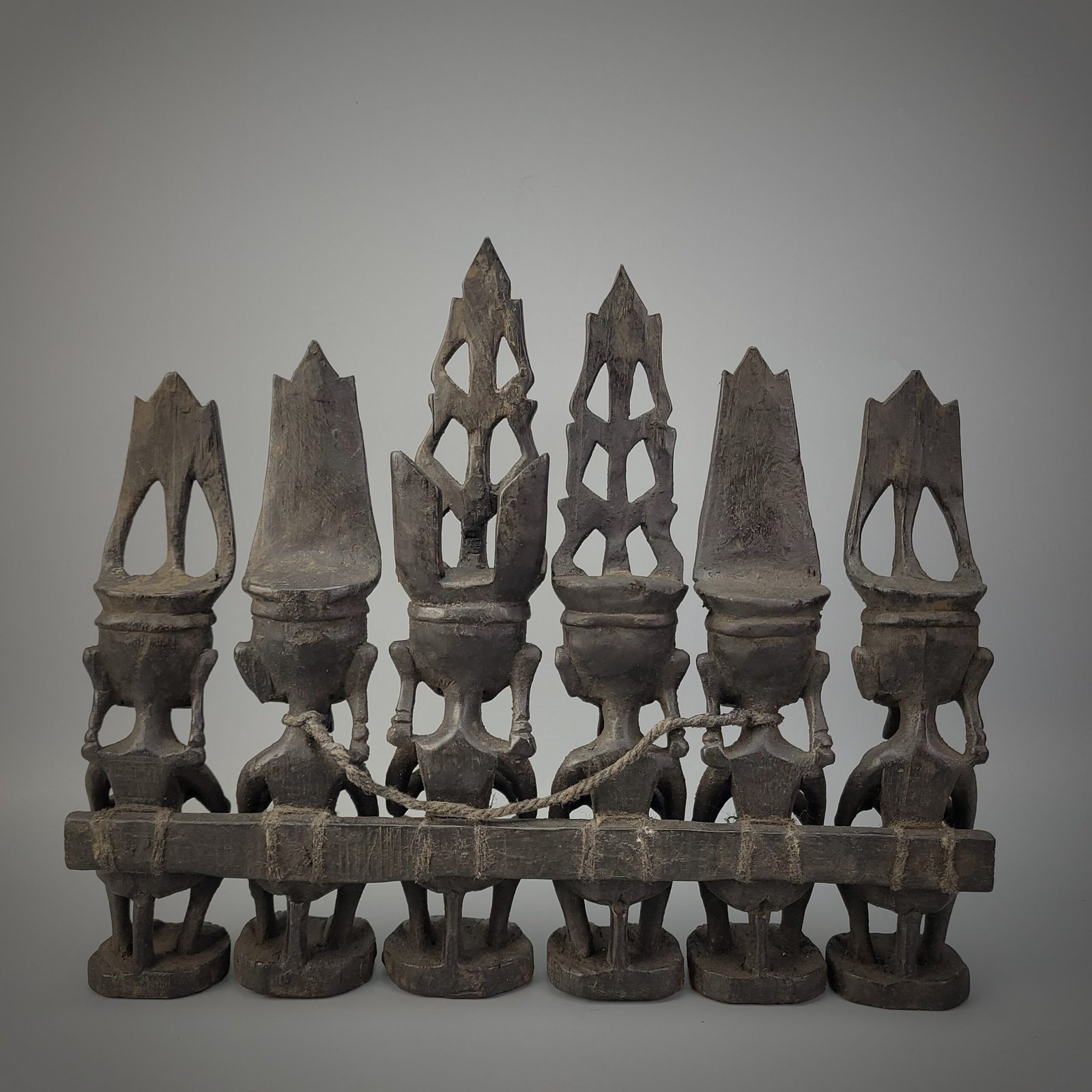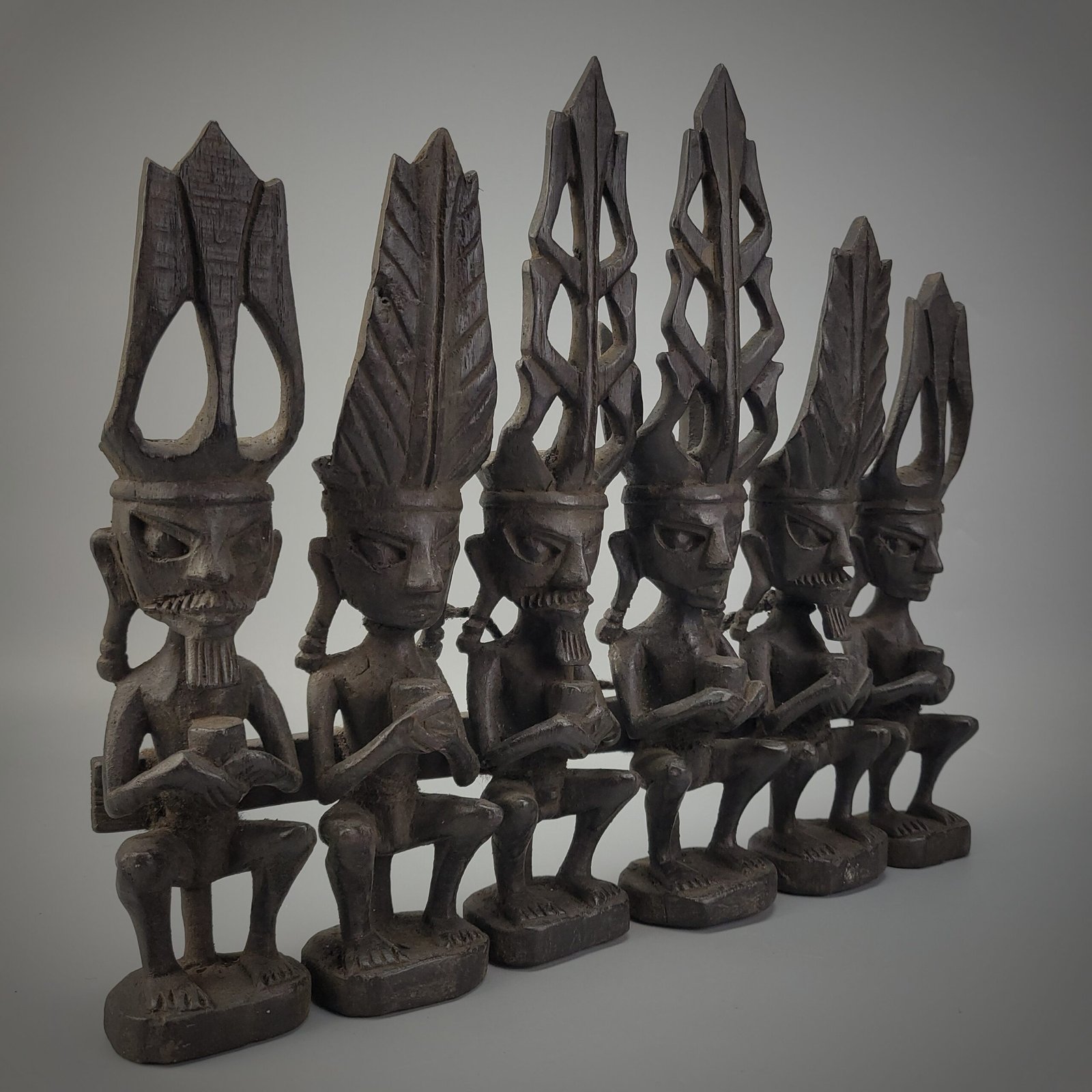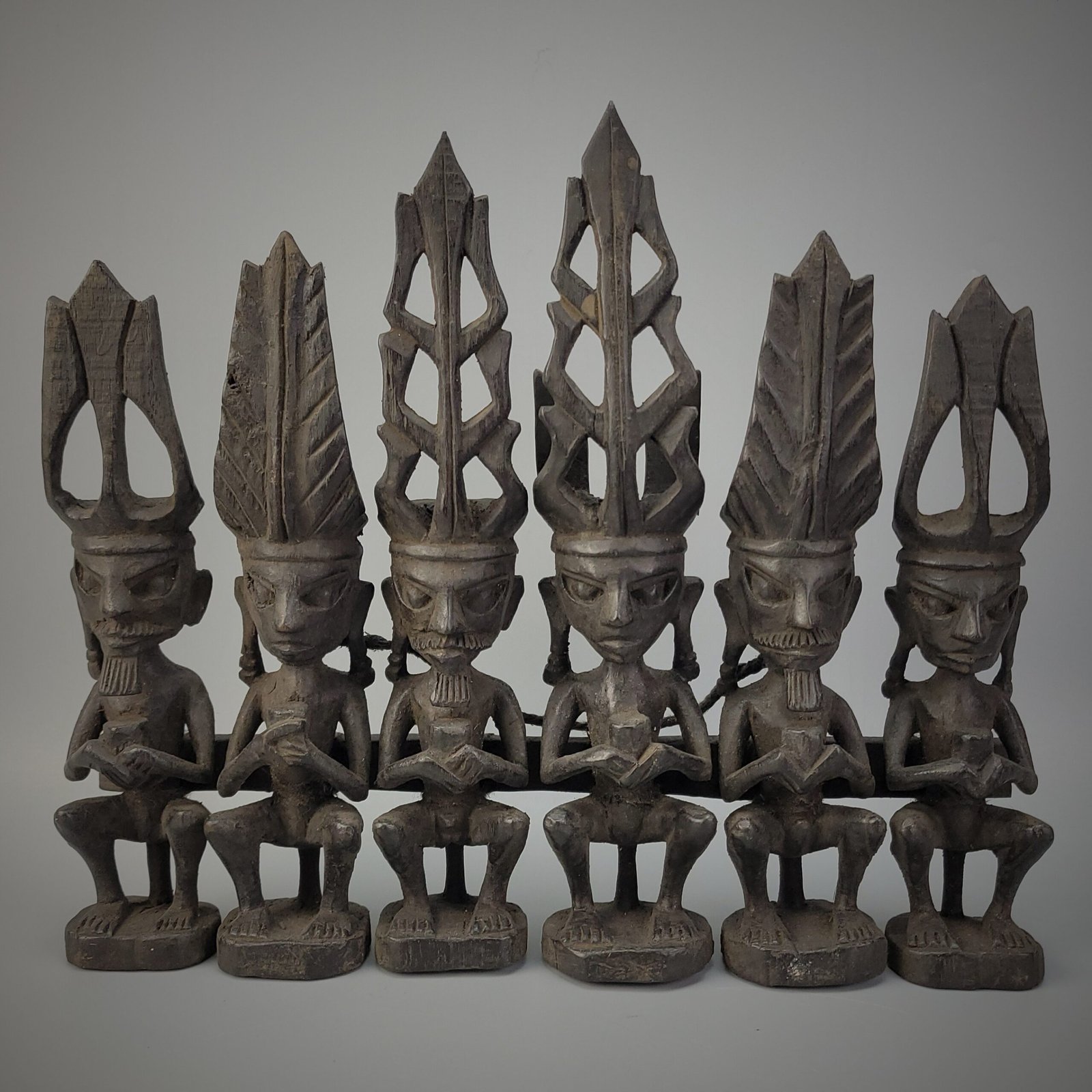 This intricately carved wooden sculpture represents six seated ancestor figures (adu zatua) from Nias Island. Each figure features elongated facial forms, stylized eyes, and tall, elaborate headdresses—symbols of status, lineage, and connection to the spiritual world. The figures are shown in a meditative pose, hands clasped at the chest, embodying ancestral wisdom and protection for the living community.