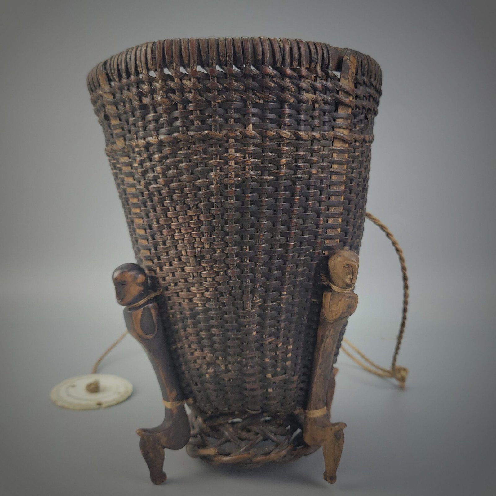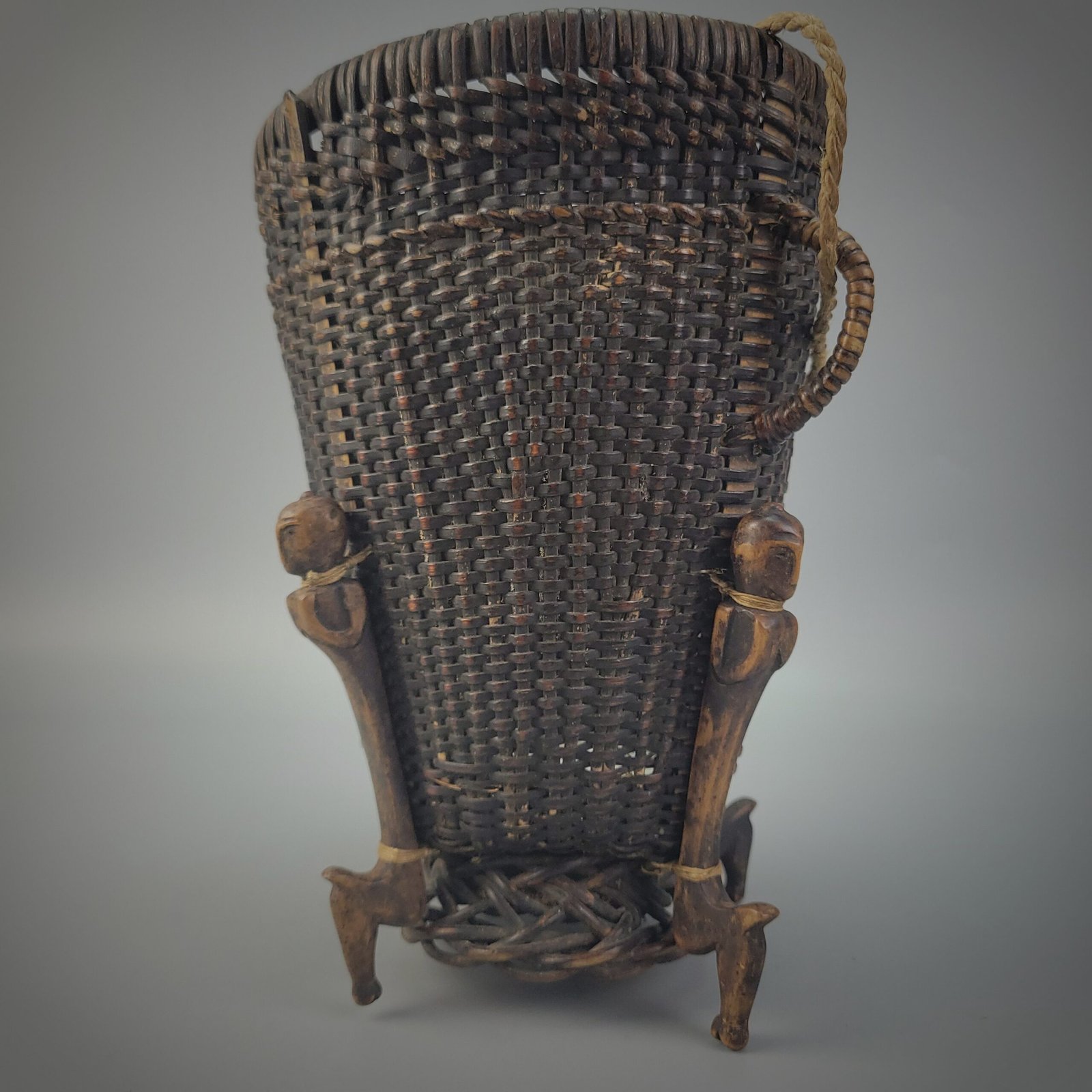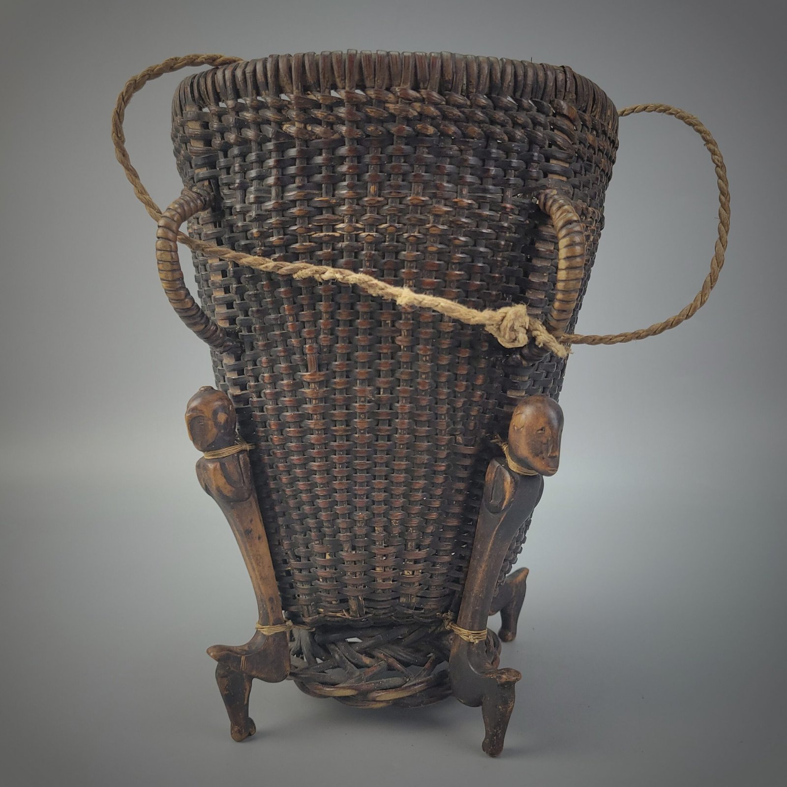 The basket is elevated on four carved anthropomorphic supports arranged symmetrically around the base. Each support is rendered as a stylized standing figure with simplified facial features and bent legs, functioning both as feet and as symbolic guardians. These carved elements are securely lashed to the basket body, integrating sculptural and utilitarian forms into a single ceremonial object.