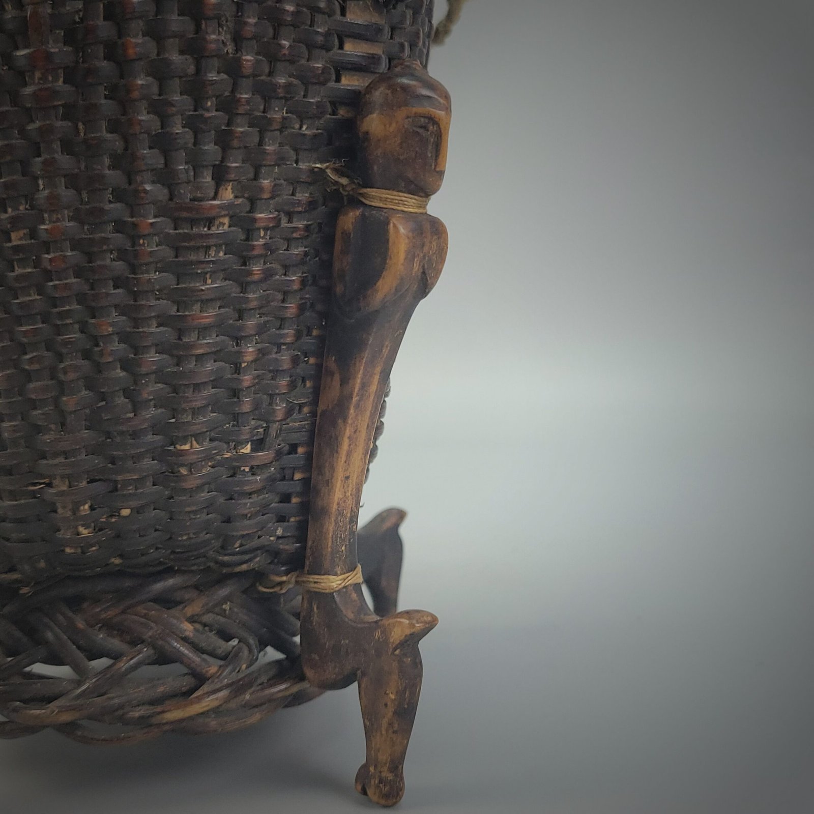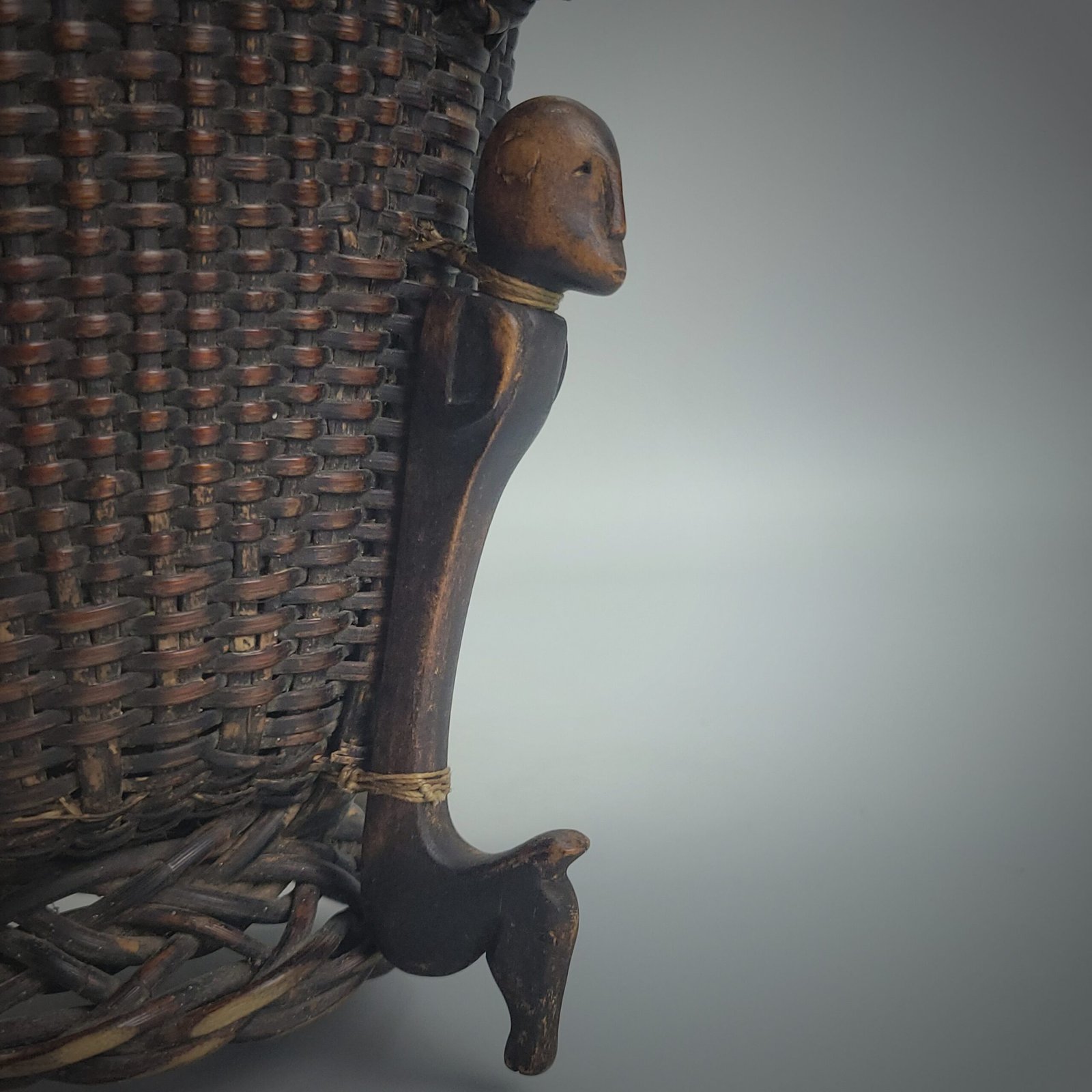 Such baskets were traditionally associated with ceremonial contexts, including ritual storage, offerings, or the safekeeping of culturally significant items. The combination of refined basketry and anthropomorphic carving reflects Iban cosmological beliefs, where protective figures and everyday objects merge to serve both practical and spiritual purposes.