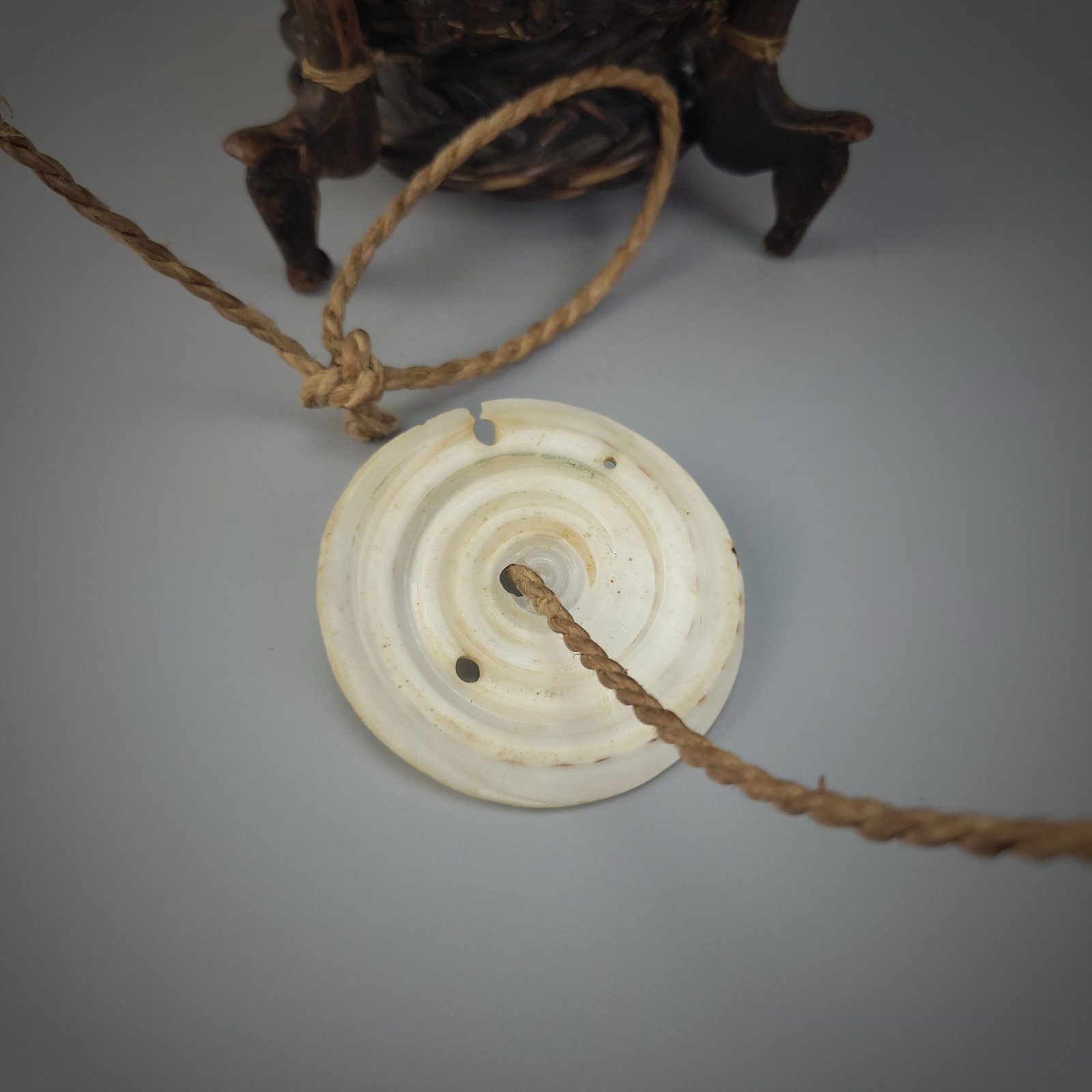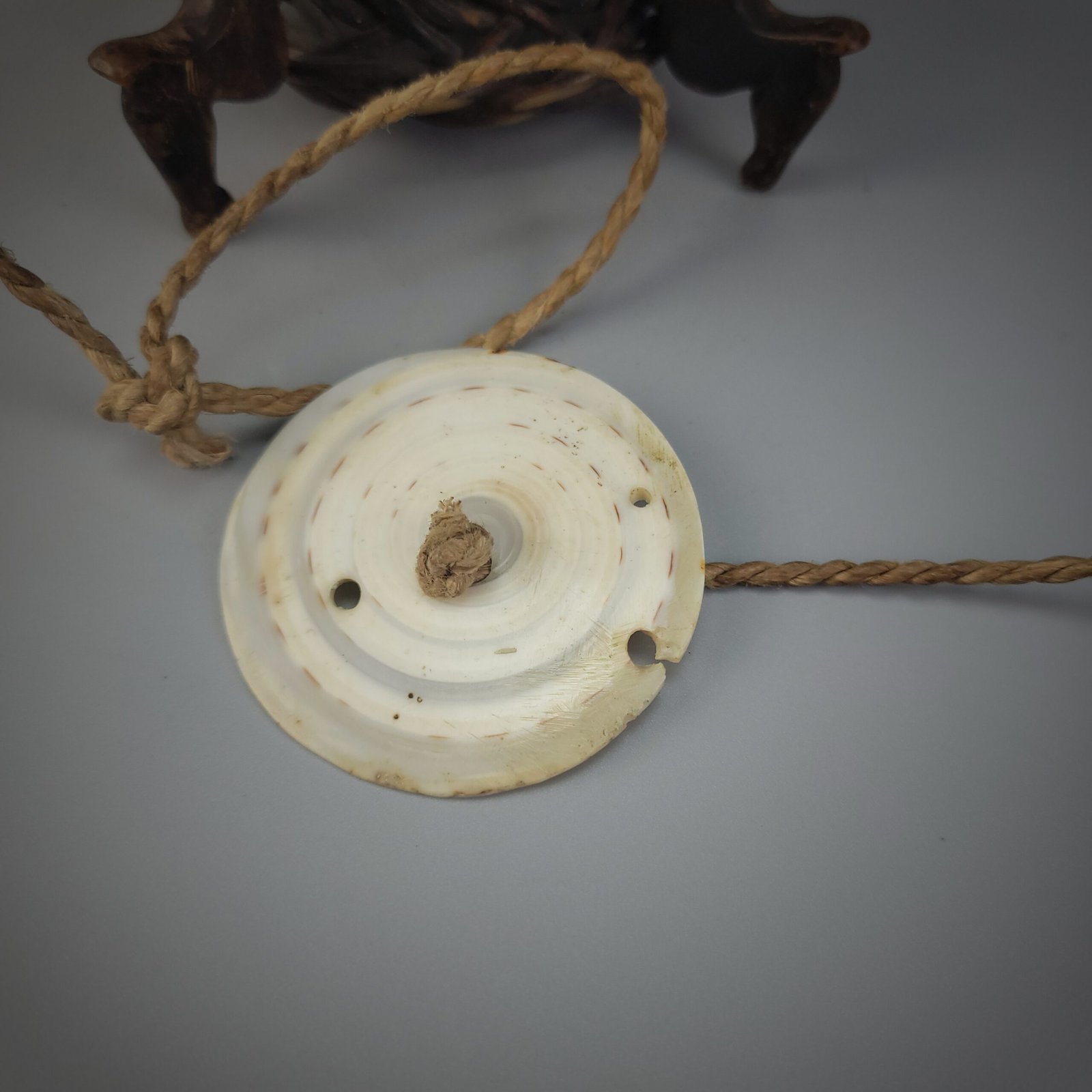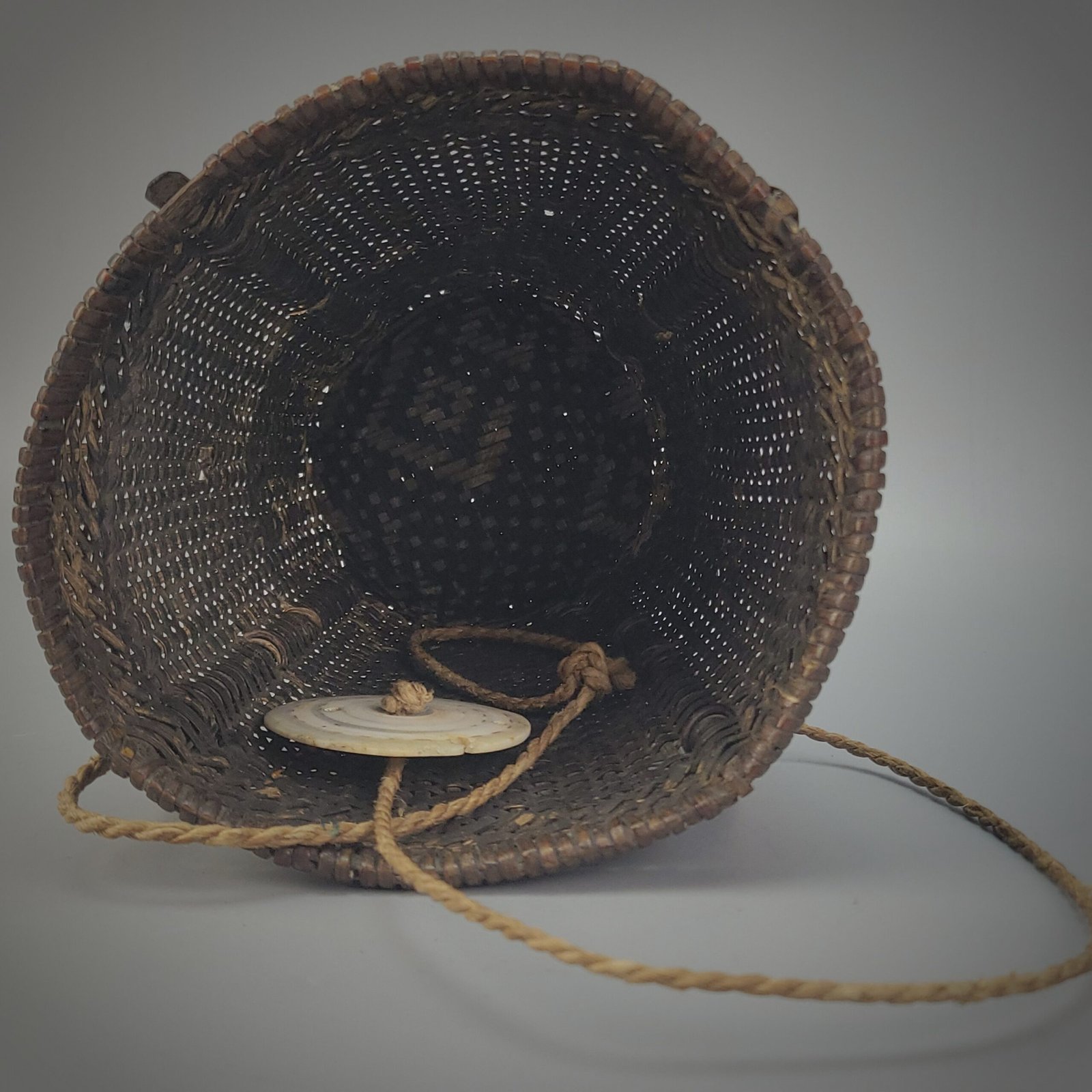 The base is constructed with a robust circular framework and cross-braced interior, indicating careful attention to durability despite the object’s ritual role. A braided cord attached to the body suggests it may have been suspended, carried, or hung during ceremonial use. The surface shows a deep, even patina consistent with age and prolonged handling, with minor abrasions and wear that attest to authentic use rather than decorative intent.