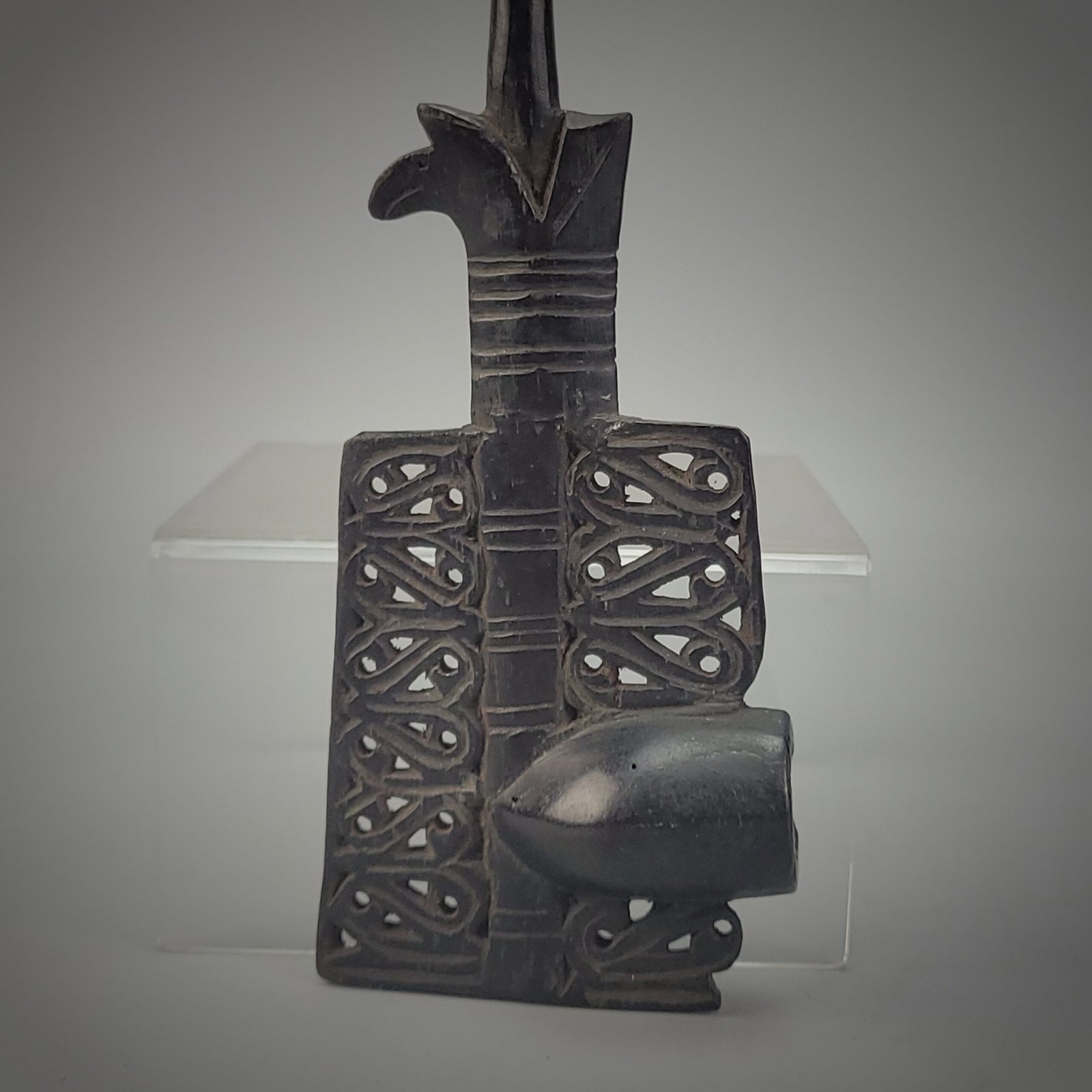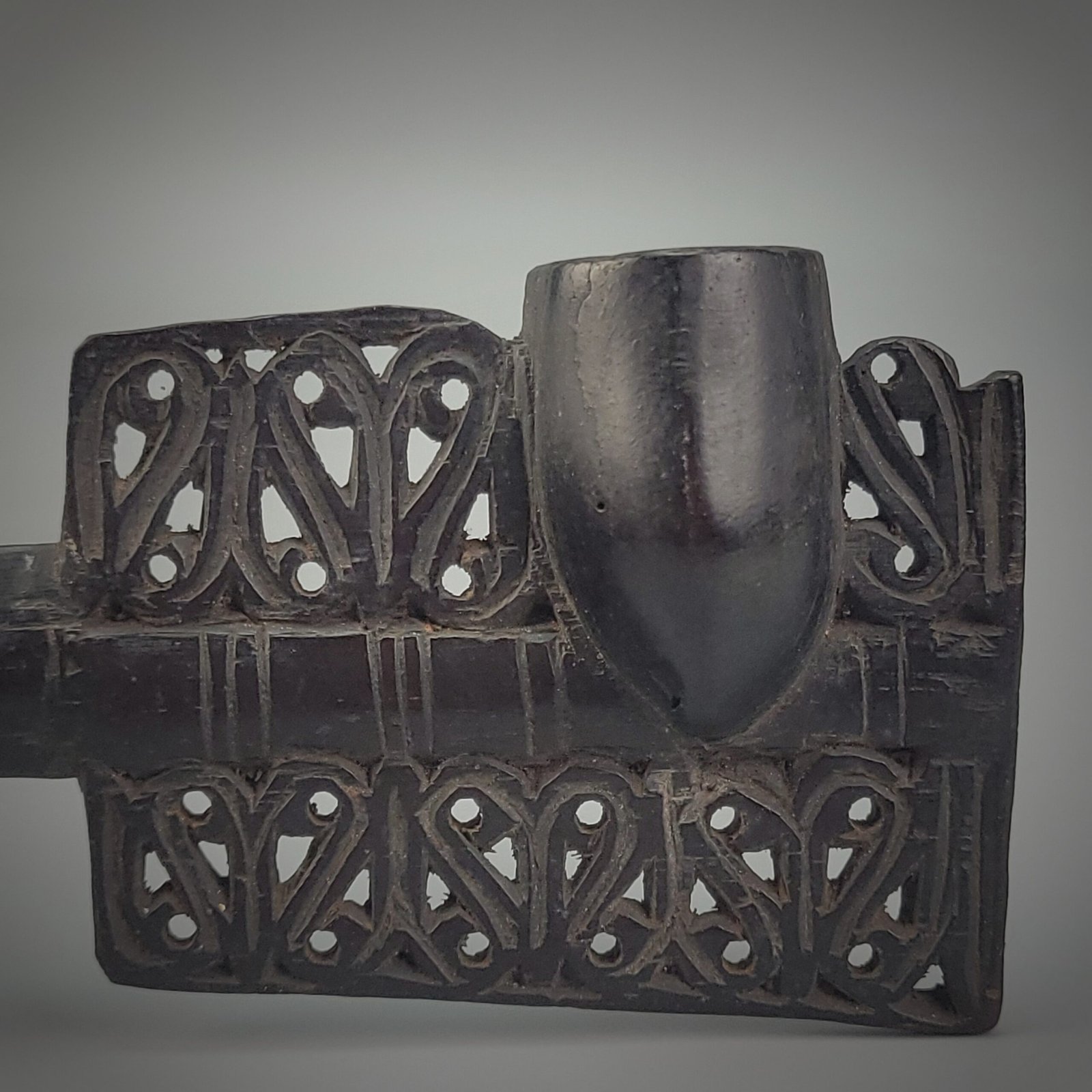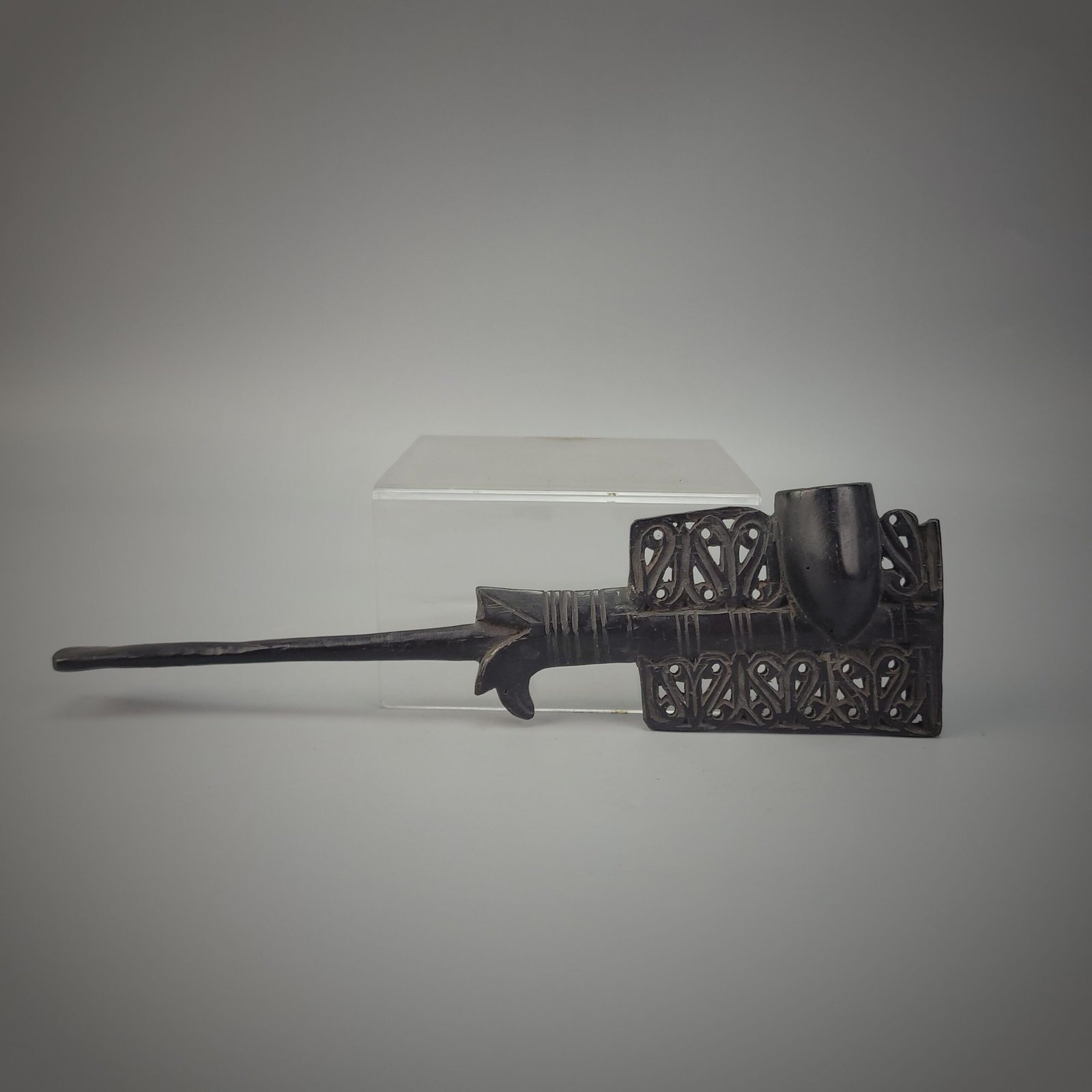 This Old Borneo Dayak Iban smoking pipe is a striking example of traditional craftsmanship from the Iban people of Sarawak, Borneo. Carved from dense dark hardwood, the pipe combines function with symbolic ornamentation. The elongated stem leads to a raised bowl, while the body is richly decorated with openwork geometric and flowing motifs, carefully pierced and carved in low relief.