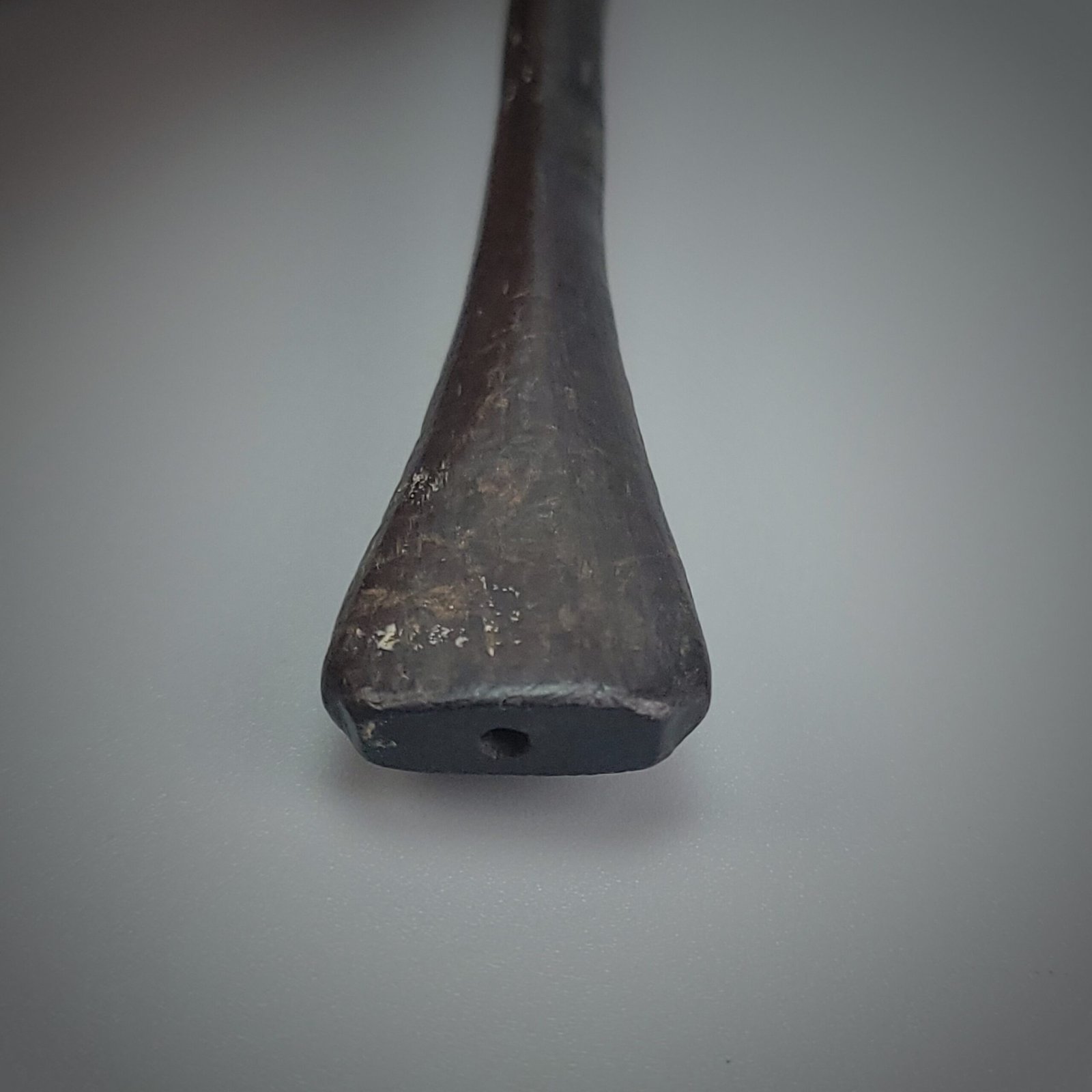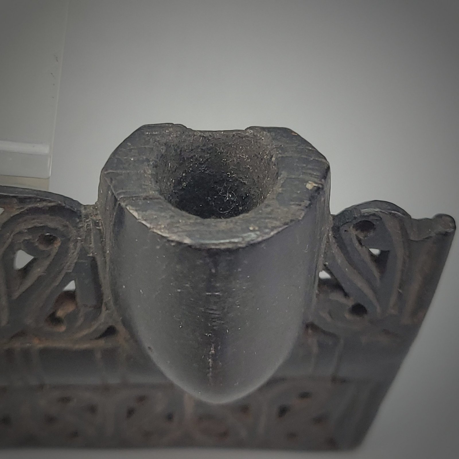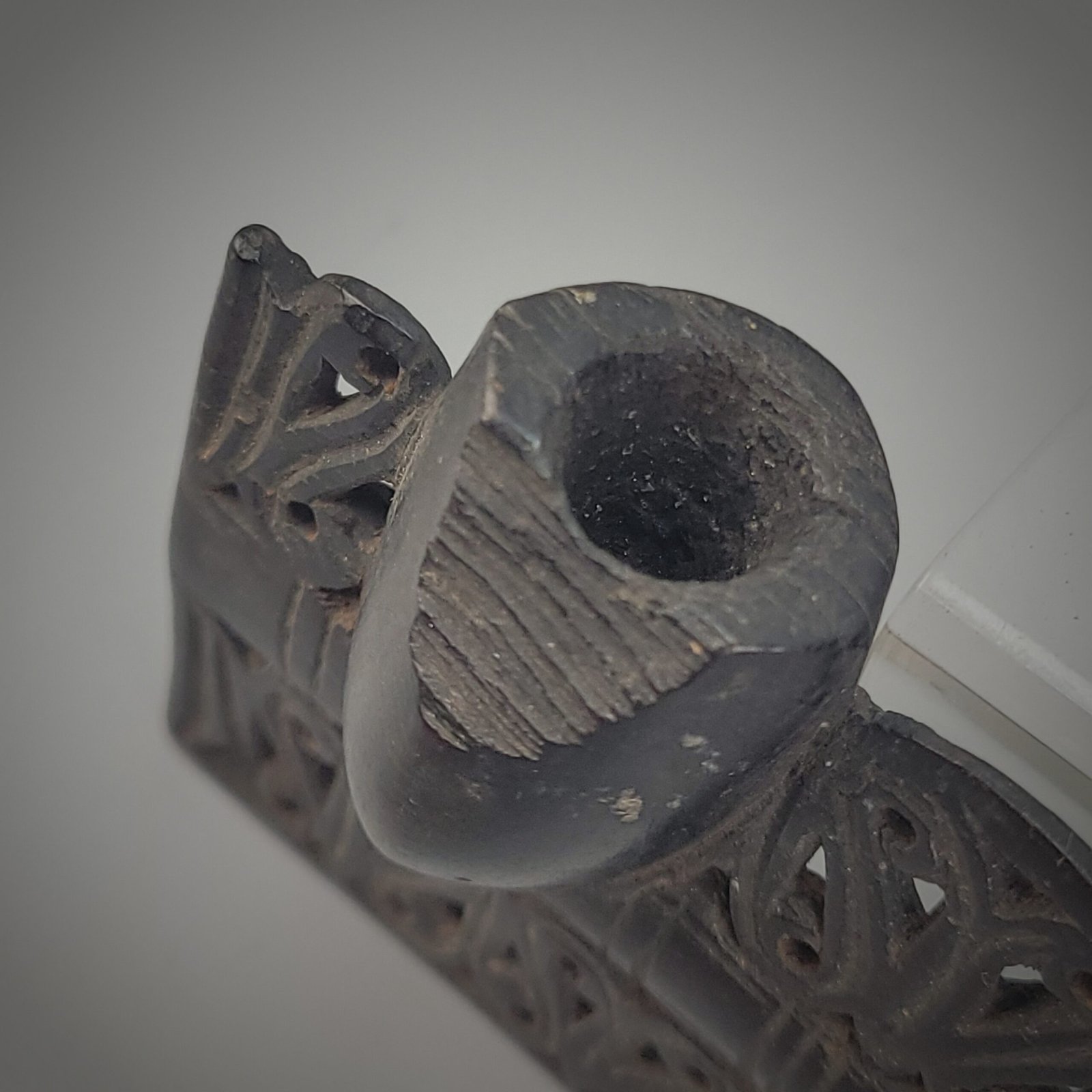 Notably, a chipped or worn section near the bowl appears intentional or at least culturally significant, rather than accidental damage. Such alterations are sometimes associated with ritual handling, repeated touching, or deliberate removal of material for non-smoking purposes.