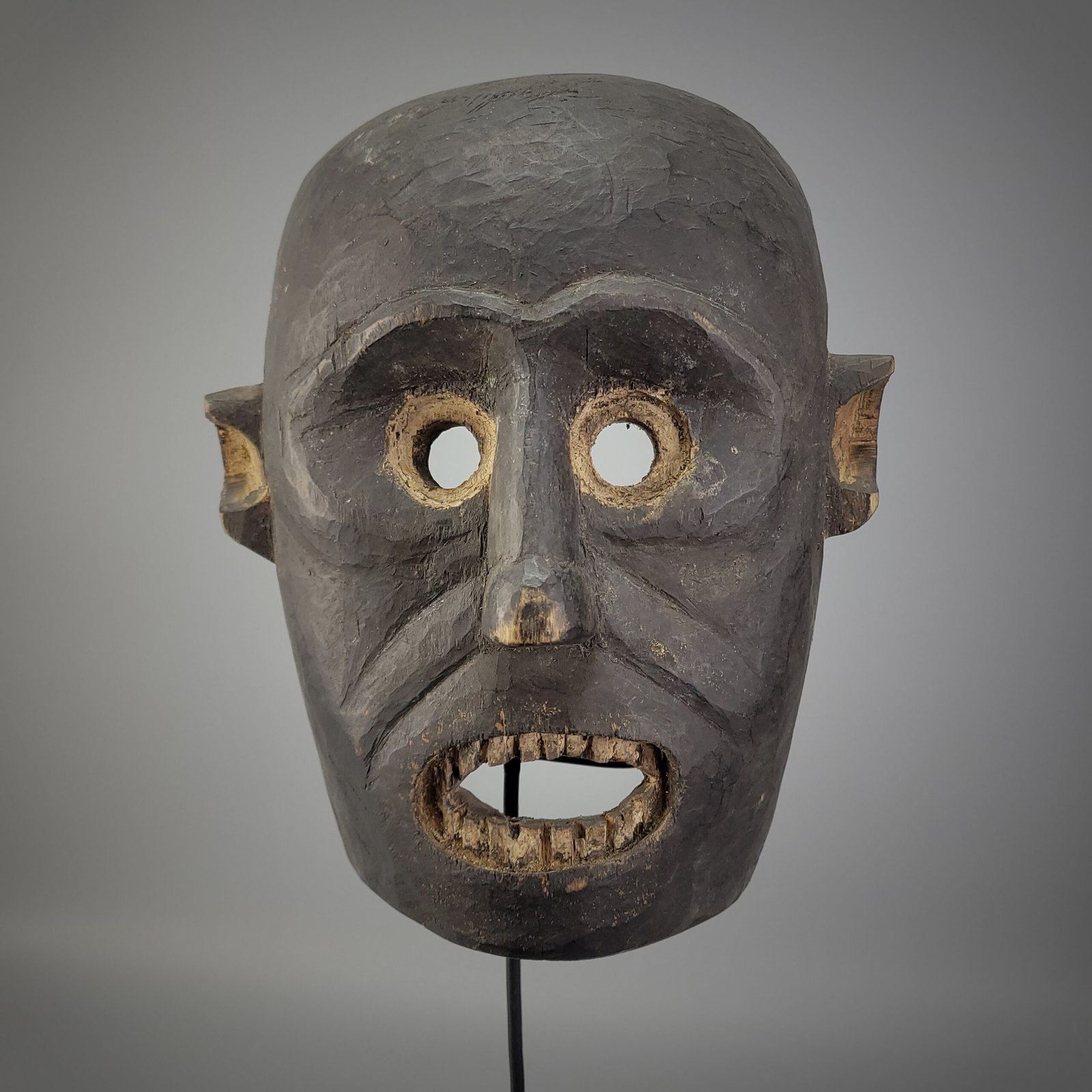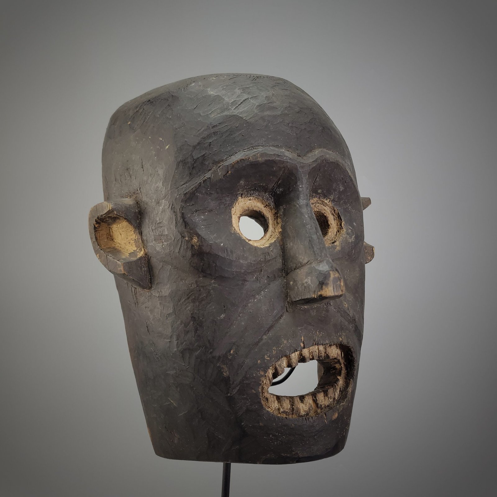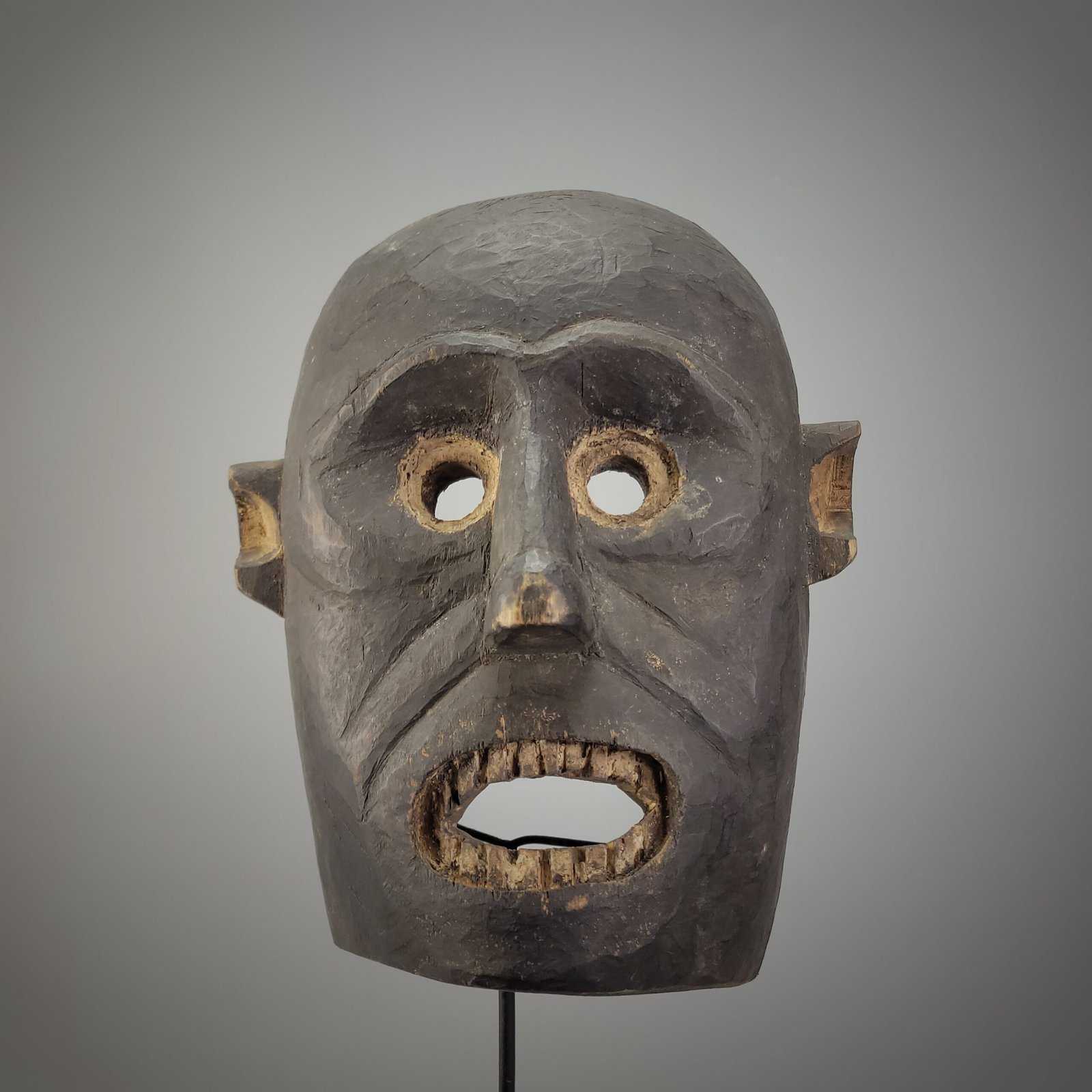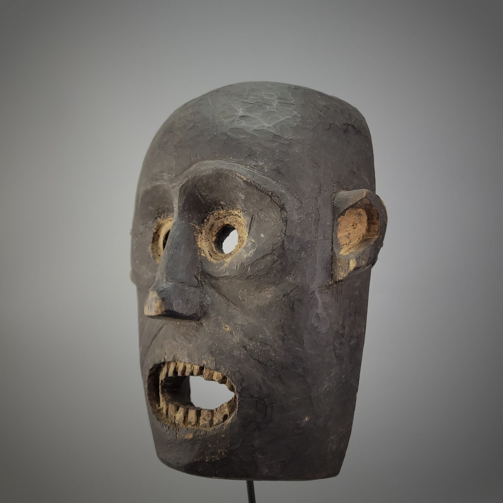 A gaping rectangular mouth with individually carved wooden teeth