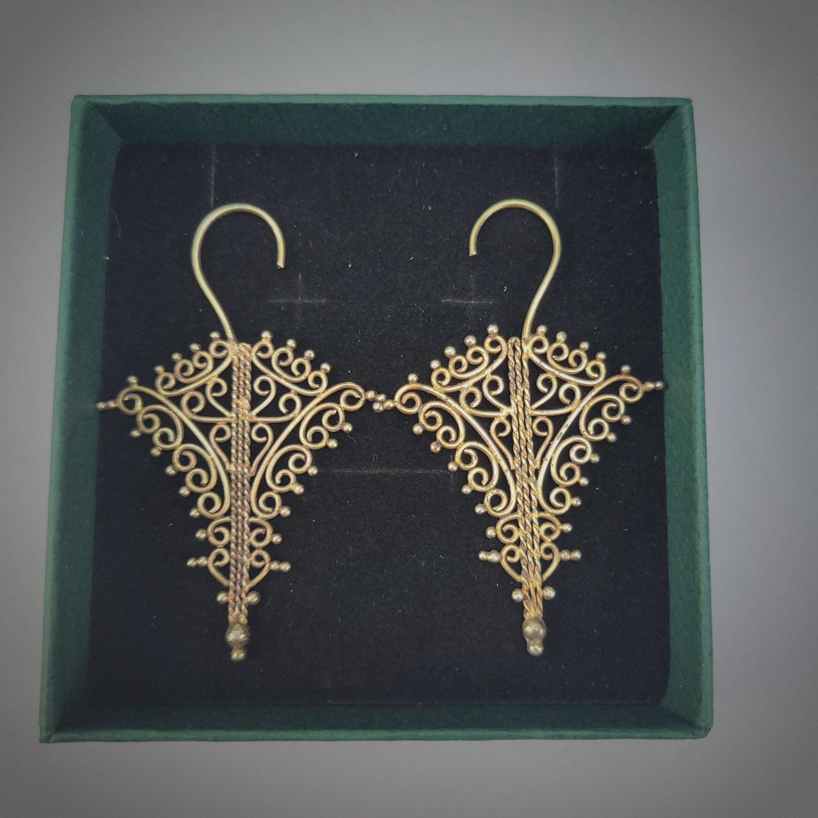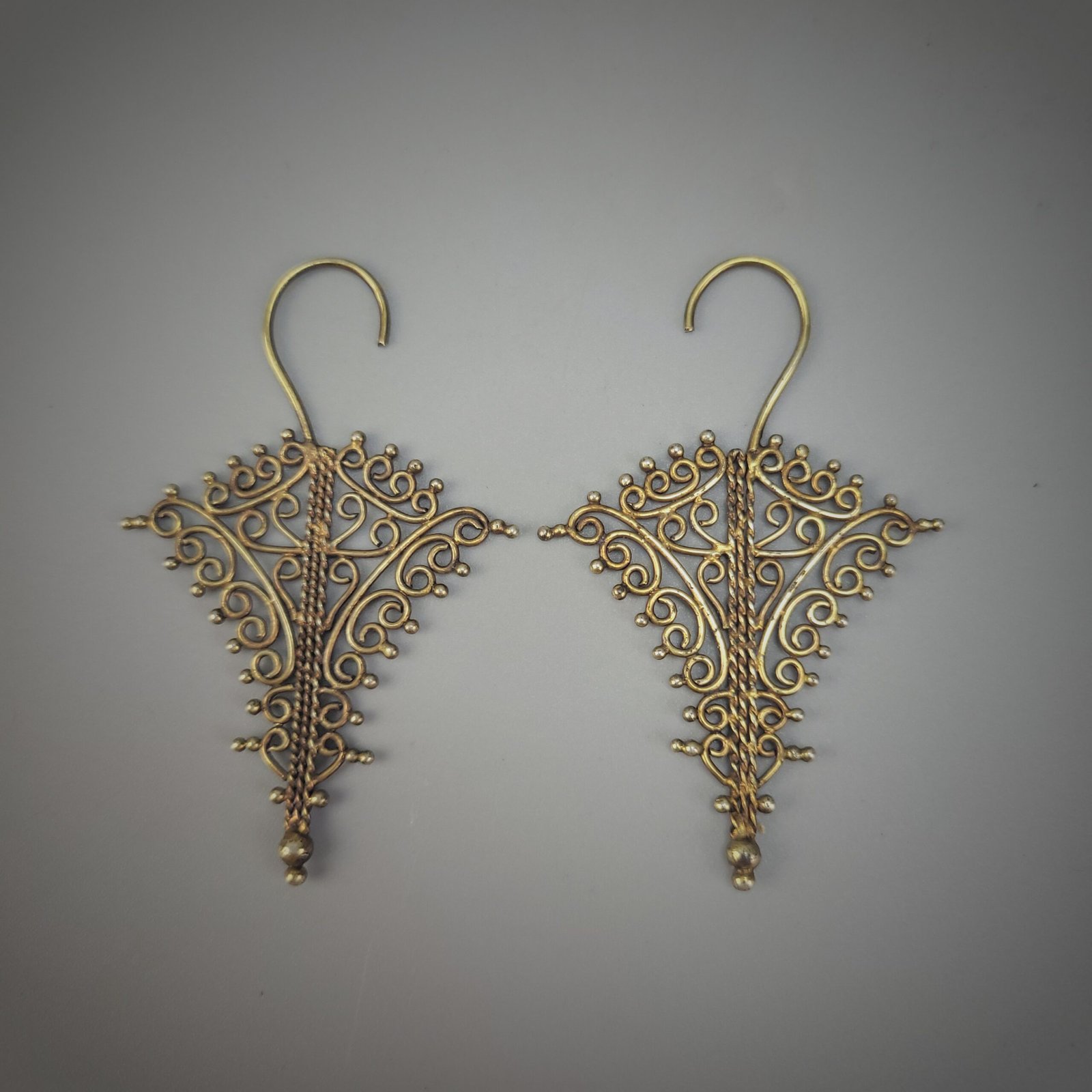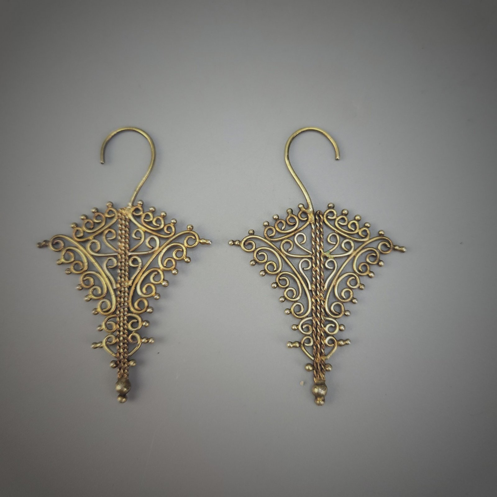 The earrings are suspended from large, hand-shaped hook fittings, indicating traditional wear and suggesting ceremonial or status-related use. The warm patina and slight irregularities in the filigree attest to age and hand workmanship rather than modern manufacture.