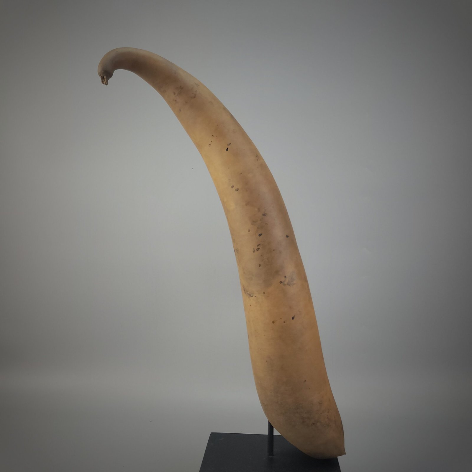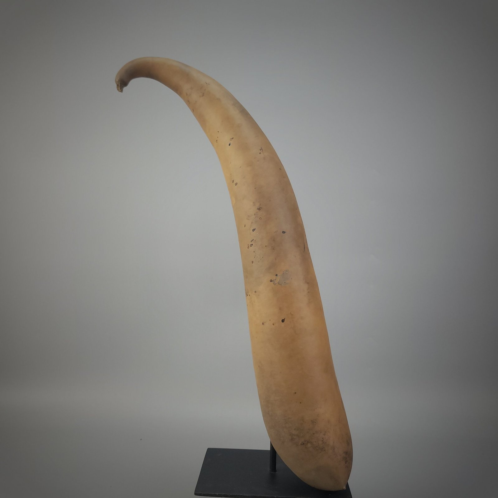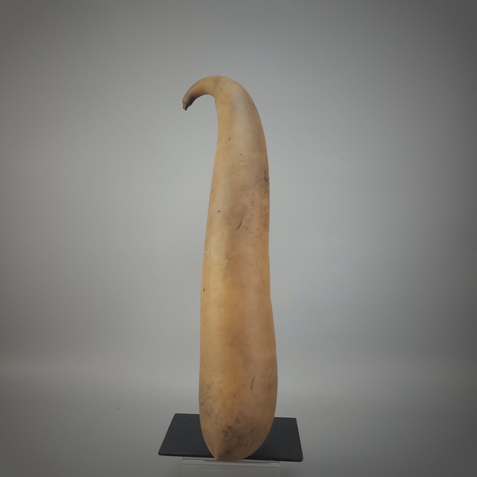 The form is long and gently tapering, with a pronounced upward curve toward the distal tip, a shape associated with particular highland groups where style, length, and curvature could signify regional identity, social status, or personal preference. The base opening is cleanly cut and hollowed, revealing the thin yet sturdy gourd wall. Surface wear and small blemishes are consistent with organic material that has been dried, shaped, and used.